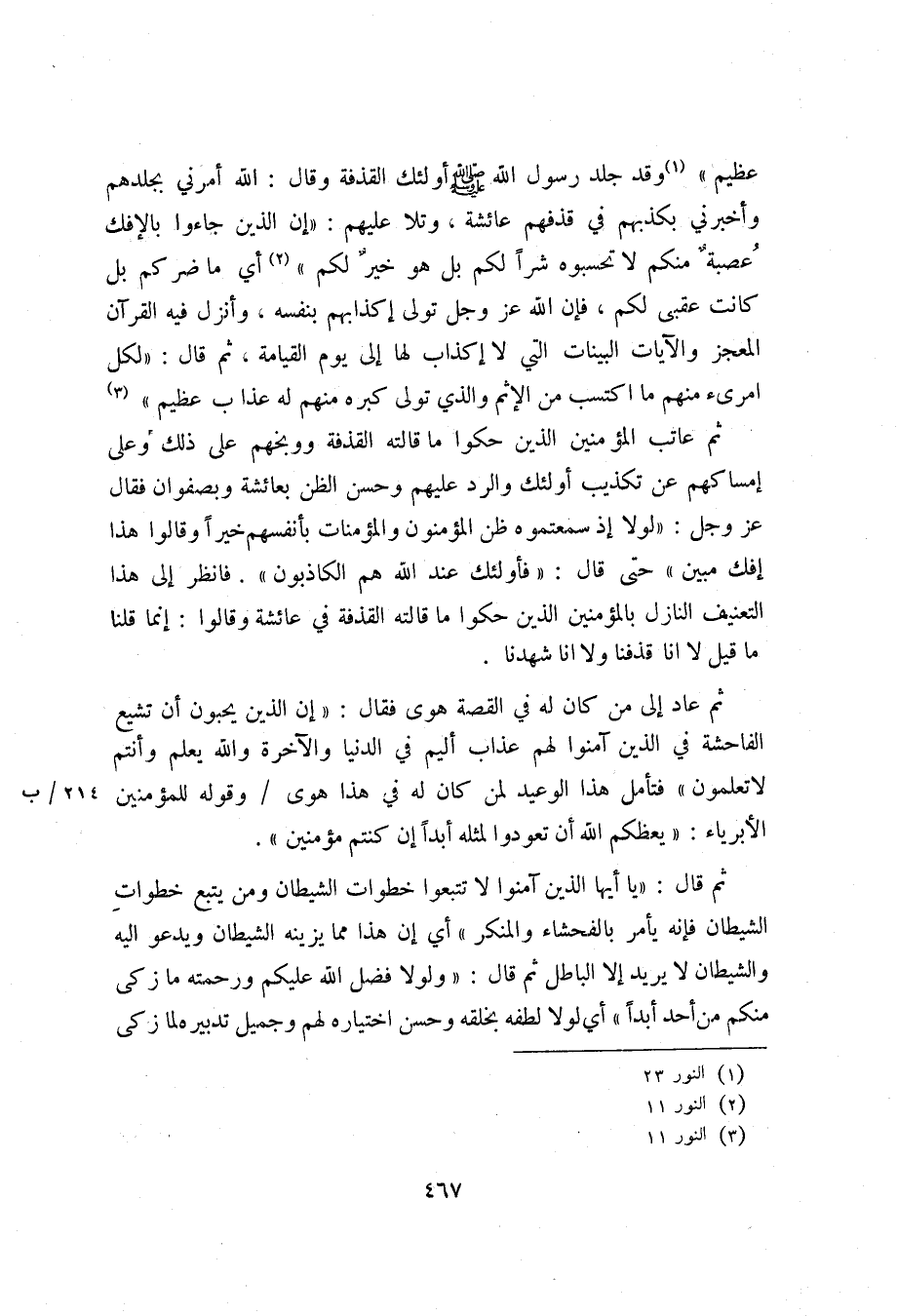 ثم عاتب المؤمنين الذين حكوا ما قالته القذفة ووبخهم على ذلك وعلى إمساكهم عن تكذيب أولئك والرد عليهم وحسن الظن بعائشة وبصفوان فقال عز وجل: «لَوْلا إِذْ سَمِعْتُمُوهُ ظَنَّ الْمُؤْمِنُونَ وَالْمُؤْمِناتُ بِأَنْفُسِهِمْ خَيْراً وَقالُوا هذا إِفْكٌ مُبِينٌ» حتى قال: «فَأُولئِكَ عِنْدَ اللَّهِ هُمُ الْكاذِبُونَ» . فانظر إلى هذا التعنيف النازل بالمؤمنين الذين حكوا ما قالته القذفة في عائشة وقالوا: إنما قلنا ما قيل لا انا قذفنا ولا انا شهدنا.