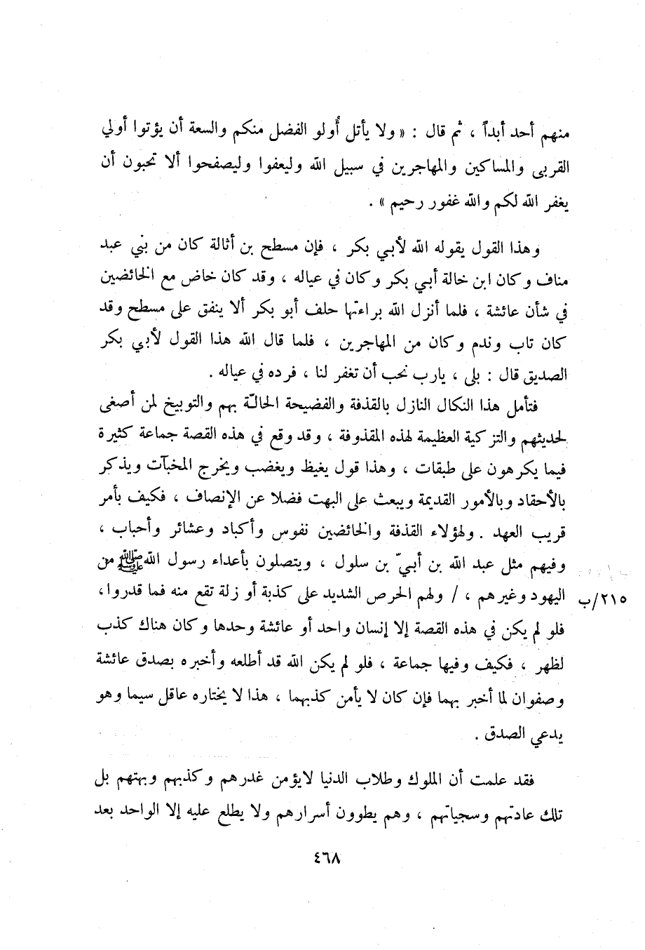 فتأمل هذا النكال النازل بالقذفة والفضيحة الحالّة بهم والتوبيخ لمن أصغى لحديثهم والتزكية العظيمة لهذه المقذوفة، وقد وقع في هذه القصة جماعة كثيرة فيما يكرهون على طبقات، وهذا قول يغيظ ويغضب ويخرج المخبات ويذكر بالأحقاد وبالأمور القديمة ويبعث على البهت فضلا عن الإنصاف، فكيف بأمر قريب العهد. ولهؤلاء القذفة والخائضين نفوس وأكباد وعشائر وأحباب، وفيهم مثل عبد الله بن أبيّ بن سلول، ويتصلون بأعداء رسول الله صلّى الله عليه وسلم من اليهود وغيرهم، / ولهم الحرص الشديد على كذبة أو زلة تقع منه فما قدروا، فلو لم يكن في هذه القصة إلا إنسان واحد أو عائشة وحدها وكان هناك كذب لظهر، فكيف وفيها جماعة، فلو لم يكن الله قد أطلعه وأخبره بصدق عائشة وصفوان لما أخبر بهما فإن كان لا يأمن كذبهما، هذا لا يختاره عاقل سيما وهو يدعي الصدق.