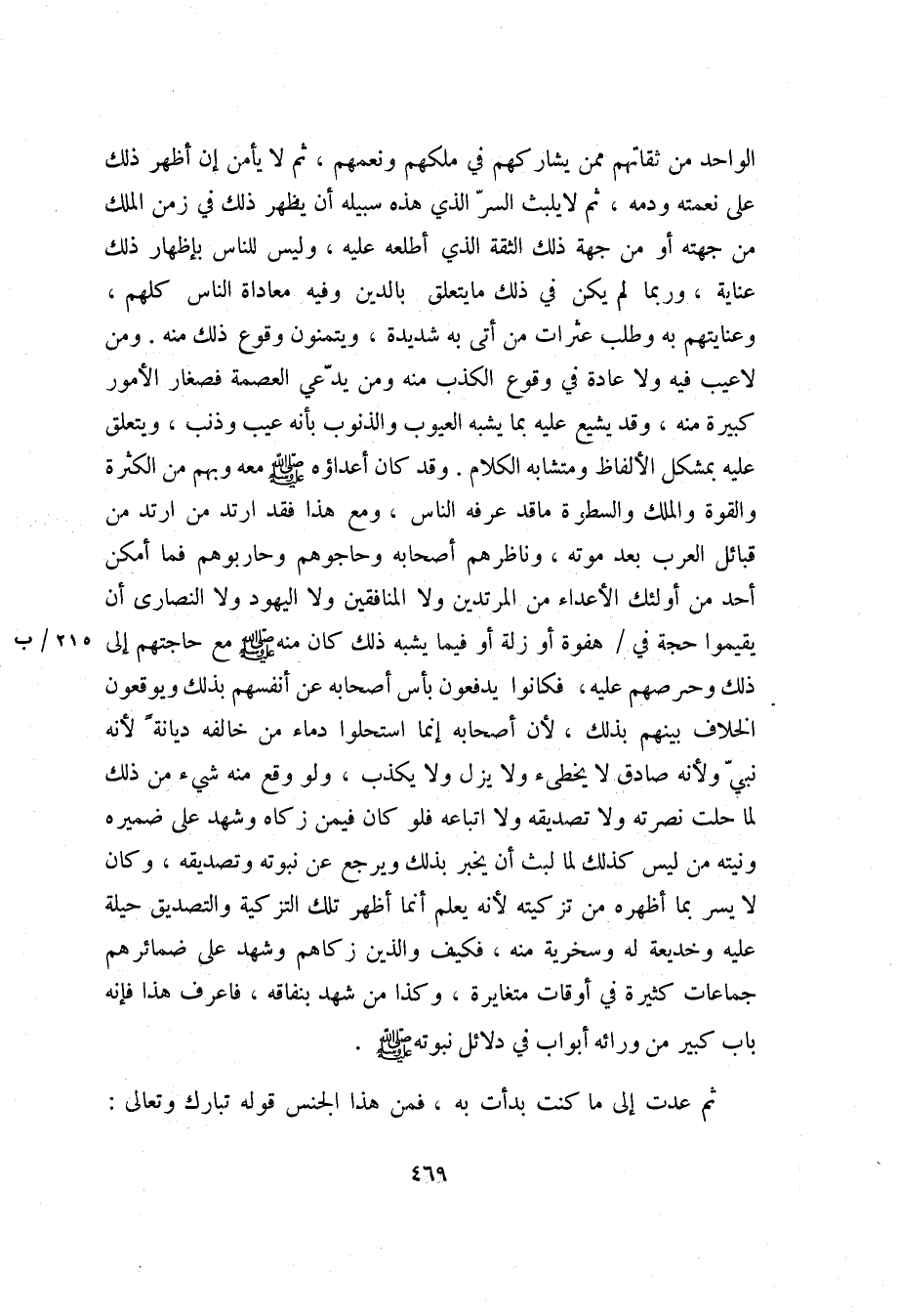 الواحد من ثقاتهم ممن يشاركهم في ملكهم ونعمهم، ثم لا يأمن إن أظهر ذلك على نعمته ودمه، ثم لا يلبث السرّ الذي هذه سبيله أن يظهر ذلك في زمن الملك من جهته أو من جهة ذلك الثقة الذي أطلعه عليه، وليس للناس بإظهار ذلك عناية، وربما لم يكن في ذلك ما يتعلق بالدين وفيه معاداة الناس كلهم، وعنايتهم به وطلب عثرات من أتى به شديدة، ويتمنون وقوع ذلك منه. ومن لا عيب فيه ولا عادة في وقوع الكذب منه ومن يدّعي العصمة فصغار الأمور كبيرة منه، وقد يشيع عليه بما يشبه العيوب والذنوب بأنه عيب وذنب، ويتعلق عليه بمشكل الألفاظ ومتشابه الكلام. وقد كان أعداؤه صلّى الله عليه وسلم معه وبهم من الكثرة والقوة والملك والسطوة ما قد عرفه الناس، ومع هذا فقد ارتد من ارتد من قبائل العرب بعد موته، وناظرهم أصحابه وحاجوهم وحاربوهم فما أمكن أحد من أولئك الأعداء من المرتدين ولا المنافقين ولا اليهود ولا النصارى أن يقيموا حجة في/ هفوة أو زلة أو فيما يشبه ذلك كان منه صلّى الله عليه وسلم مع حاجتهم إلى ذلك وحرصهم عليه، فكانوا يدفعون بأس أصحابه عن أنفسهم بذلك ويوقعون الخلاف بينهم بذلك، لأن أصحابه إنما استحلوا دماء من خالفه ديانة لأنه نبيّ ولأنه صادق لا يخطىء ولا يزل ولا يكذب، ولو وقع منه شيء من ذلك لما حلت نصرته ولا تصديقه ولا اتباعه فلو كان فيمن زكاه وشهد على ضميره ونيته من ليس كذلك لما لبث أن يخبر بذلك ويرجع عن نبوته وتصديقه، وكان لا يسر بما أظهره من تزكيته لأنه يعلم أنما أظهر تلك التزكية والتصديق حيلة عليه وخديعة له وسخرية منه، فكيف والذين زكاهم وشهد على ضمائرهم جماعات كثيرة في أوقات متغايرة، وكذا من شهد بنفاقه، فاعرف هذا فإنه باب كبير من ورائه أبواب في دلائل نبوته صلّى الله عليه وسلم.