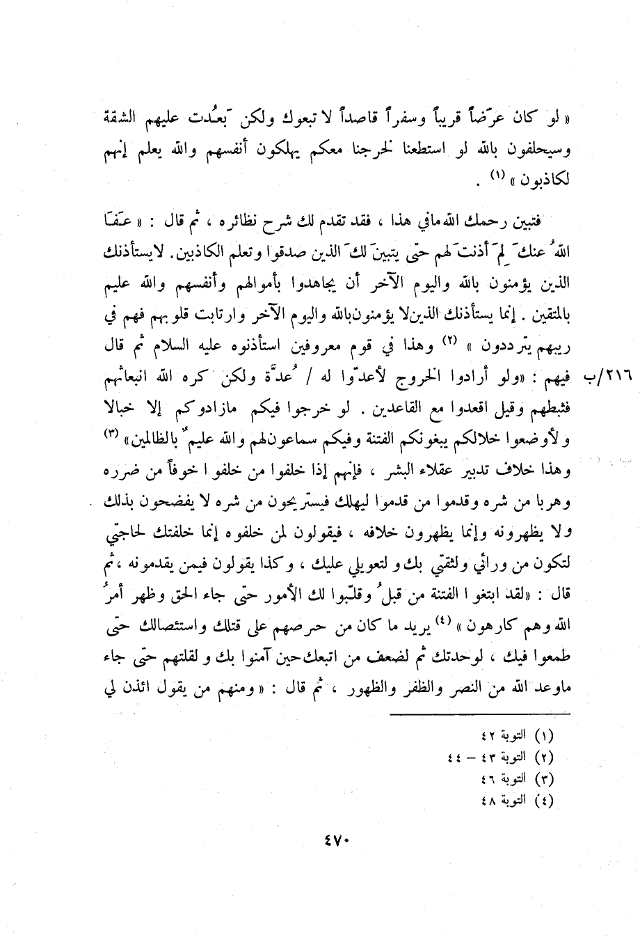 فتبين رحمك الله ما في هذا، فقد تقدم لك شرح نظائره، ثم قال: «عَفَا اللَّهُ عَنْكَ لِمَ أَذِنْتَ لَهُمْ حَتَّى يَتَبَيَّنَ لَكَ الَّذِينَ صَدَقُوا وَتَعْلَمَ الْكاذِبِينَ. لا يَسْتَأْذِنُكَ الَّذِينَ يُؤْمِنُونَ بِاللَّهِ وَالْيَوْمِ الْآخِرِ أَنْ يُجاهِدُوا بِأَمْوالِهِمْ وَأَنْفُسِهِمْ وَاللَّهُ عَلِيمٌ بِالْمُتَّقِينَ. إِنَّما يَسْتَأْذِنُكَ الَّذِينَ لا يُؤْمِنُونَ بِاللَّهِ وَالْيَوْمِ الْآخِرِ وَارْتابَتْ قُلُوبُهُمْ فَهُمْ فِي رَيْبِهِمْ يَتَرَدَّدُونَ» «2» وهذا في قوم معروفين استأذنوه عليه السلام ثم قال فيهم: «وَلَوْ أَرادُوا الْخُرُوجَ لَأَعَدُّوا لَهُ/ عُدَّةً وَلكِنْ كَرِهَ اللَّهُ انْبِعاثَهُمْ فَثَبَّطَهُمْ وَقِيلَ اقْعُدُوا مَعَ الْقاعِدِينَ. لَوْ خَرَجُوا فِيكُمْ ما زادُوكُمْ إِلَّا خَبالًا وَلَأَوْضَعُوا خِلالَكُمْ يَبْغُونَكُمُ الْفِتْنَةَ وَفِيكُمْ سَمَّاعُونَ لَهُمْ وَاللَّهُ عَلِيمٌ بِالظَّالِمِينَ» «3» وهذا خلاف تدبير عقلاء البشر، فإنهم إذا خلفوا من خلفوا خوفا من ضرره وهربا من شره وقدموا من قدموا ليهلك فيستريحون من شره لا يفضحون بذلك ولا يظهرونه وإنما يظهرون خلافه، فيقولون لمن خلفوه إنما خلفتك لحاجتي لتكون من ورائي ولثقتي بك ولتعويلي عليك، وكذا يقولون فيمن يقدمونه، ثم قال: «لَقَدِ ابْتَغَوُا الْفِتْنَةَ مِنْ قَبْلُ وَقَلَّبُوا لَكَ الْأُمُورَ حَتَّى جاءَ الْحَقُّ وَظَهَرَ أَمْرُ اللَّهِ وَهُمْ كارِهُونَ» «4» يريد ما كان من حرصهم على قتلك واستئصالك حتى طمعوا فيك، لوحدتك ثم لضعف من اتبعك حين آمنوا بك ولقلتهم حتى جاء ما وعد الله من النصر والظفر والظهور، ثم قال: «وَمِنْهُمْ مَنْ يَقُولُ ائْذَنْ لِي