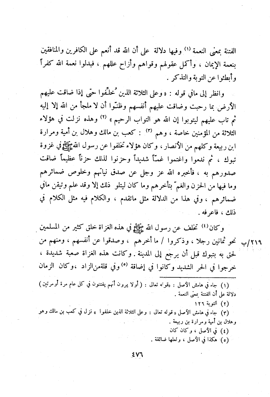 (3) جاء في هامش الأصل «قوله تعالى: وَعَلَى الثَّلاثَةِ الَّذِينَ خُلِّفُوا» نزل في كعب بن مالك وهو وهلال بن أمية ومرارة بن ربيعة.