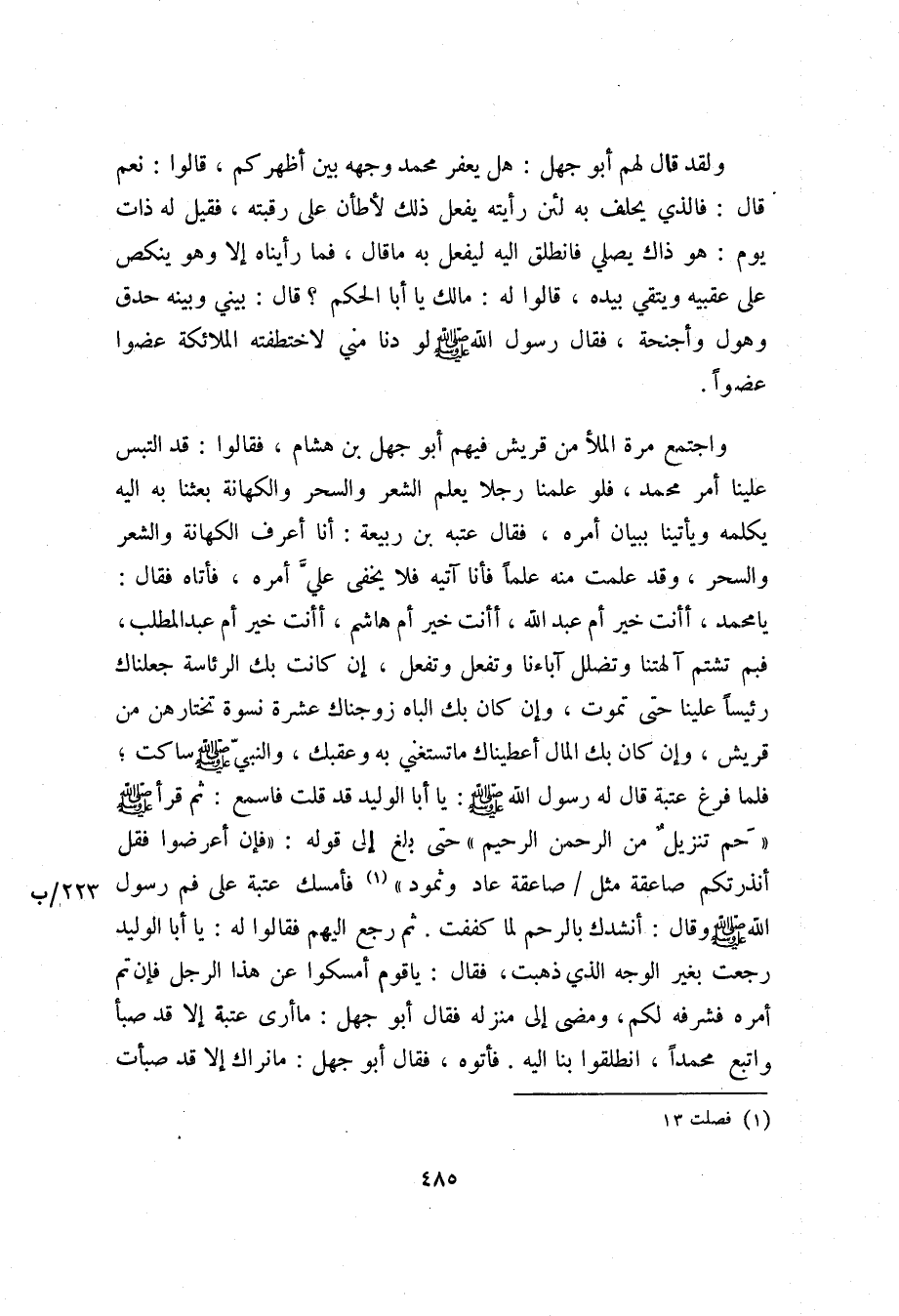 يا محمد، أأنت خير أم عبد الله، أأنت خير أم هاشم، أأنت خير أم عبد المطلب، فبم تشتم آلهتنا وتضلل آباءنا وتفعل وتفعل، إن كانت بك الرئاسة جعلناك رئيسا علينا حتى تموت، وإن كان بك الباه زوجناك عشرة نسوة تختارهن من قريش، وإن كان بك المال أعطيناك ما تستغني به وعقبك، والنبيّ صلّى الله عليه وسلم ساكت؛ فلما فرغ عتبة قال له رسول الله صلّى الله عليه وسلم: يا أبا الوليد قد قلت فاسمع: ثم قرأ صلّى الله عليه وسلم «حم تَنْزِيلٌ مِنَ الرَّحْمنِ الرَّحِيمِ» حتى بلغ إلى قوله: «فَإِنْ أَعْرَضُوا فَقُلْ أَنْذَرْتُكُمْ صاعِقَةً مِثْلَ/ صاعِقَةِ عادٍ وَثَمُودَ» «1» فأمسك عتبة على فم رسول الله صلّى الله عليه وسلم وقال: أنشدك بالرحم لما كففت. ثم رجع اليهم فقالوا له: يا أبا الوليد رجعت بغير الوجه الذي ذهبت، فقال: يا قوم أمسكوا عن هذا الرجل فإن تم أمره فشرفه لكم، ومضى إلى منزله فقال أبو جهل: ما أرى عتبة إلا قد صبأ واتبع محمدا، انطلقوا بنا اليه. فأتوه، فقال أبو جهل: ما نراك إلا قد صبأت