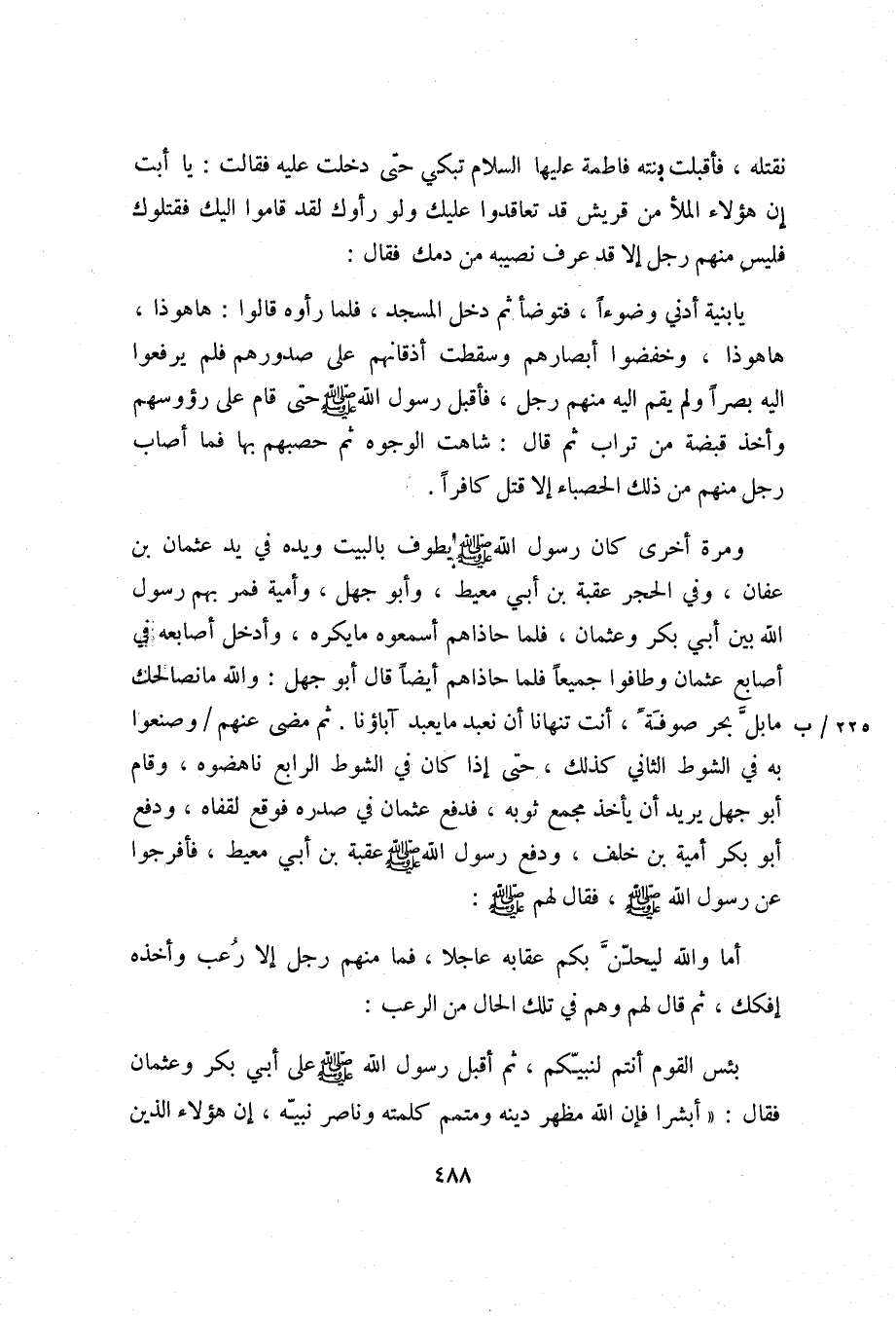 يا بنية أدني وضوآ، فتوضأ ثم دخل المسجد، فلما رأوه قالوا: هاهو ذا، هاهو ذا، وخفضوا أبصارهم وسقطت أذقانهم على صدورهم فلم يرفعوا اليه بصرا ولم يقم اليه منهم رجل، فأقبل رسول الله صلّى الله عليه وسلم حتى قام على رؤوسهم وأخذ قبضة من تراب ثم قال: شاهت الوجوه ثم حصبهم بها فما أصاب رجل منهم من ذلك الحصباء إلا قتل كافرا.