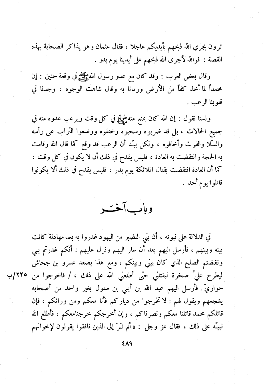 في الدلالة على نبوته، أن بني النضير من اليهود غدروا به بعد مهادنة كانت بينه وبينهم، فأرسل اليهم بعد أن سار اليهم ونزل عليهم: أنكم غدرتم بي ونقضتم الصلح الذي كان بيني وبينكم، ومع هذا يصعد عمرو بن جحاش ليطرح عليّ صخرة ليقتلني حتى أطلعني الله على ذلك، / فاخرجوا من حواريّ. فأرسل اليهم عبد الله بن أبي بن سلول بغير واحد من أصحابه يشجعهم ويقول لهم: لا تخرجوا من دياركم فأنا معكم ومن ورائكم، فإن قاتلكم محمد قاتلنا معكم ونصرناكم، وإن أخرجكم خرجنا معكم، فأطلع الله نبيّه على ذلك، فقال عز وجل: «أَلَمْ تَرَ إِلَى الَّذِينَ نافَقُوا يَقُولُونَ لِإِخْوانِهِمُ