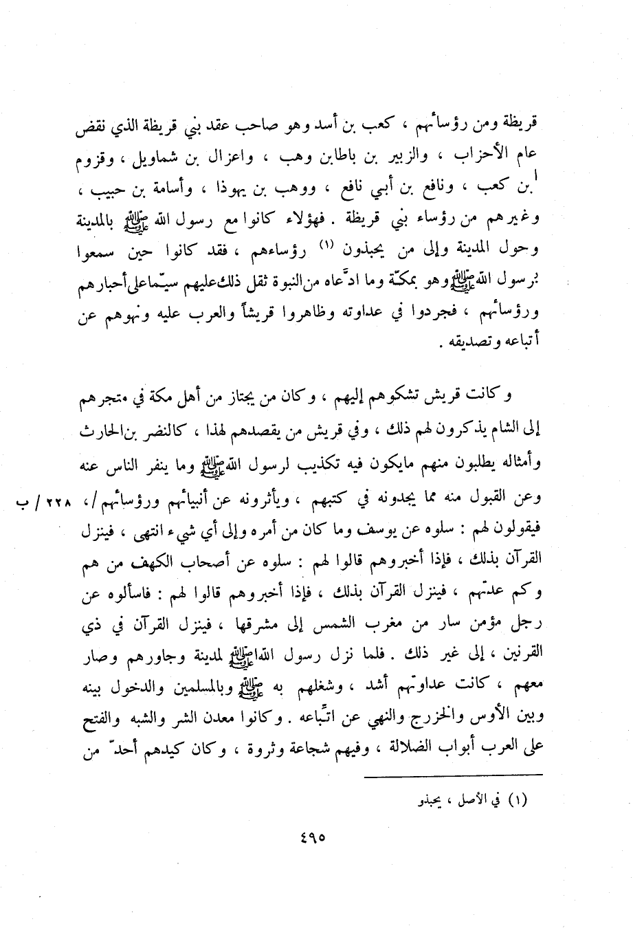 قريظة ومن رؤسائهم، كعب بن أسد وهو صاحب عقد بني قريظة الذي نقض عام الأحزاب، والزبير بن باطا بن وهب، واعزال بن شماويل، وقزوم بن كعب، ونافع بن أبي نافع، ووهب بن يهوذا، وأسامة بن حبيب، وغيرهم من رؤساء بني قريظة. فهؤلاء كانوا مع رسول الله صلّى الله عليه وسلم بالمدينة وحول المدينة وإلى من يحبذون «1» رؤساءهم، فقد كانوا حين سمعوا رسول الله صلّى الله عليه وسلم وهو بمكّة وما ادّعاه من النبوة ثقل ذلك عليهم سيّما على أحبارهم ورؤسائهم، فجردوا في عداوته وظاهروا قريشا والعرب عليه ونهوهم عن أتباعه وتصديقه.