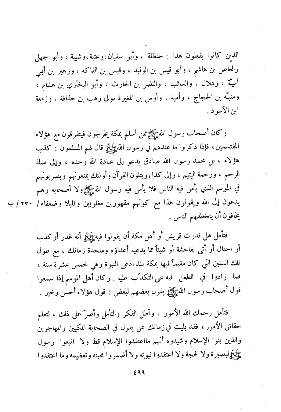 فتأمل رحمك الله الأمور، وأطل الفكر والتأمل وأصرّ على ذلك، لتعلم حقائق الأمور، فقد بليت في زمانك بمن يقول في الصحابة المكيين والمهاجرين والذين بنوا الإسلام وشيدوه أنهم ما اعتقدوا الإسلام قط ولا اتبعوا رسول صلّى الله عليه وسلم لبصيرة ولا لحجة ولا اعتقدوا نبوته ولا أضمروا محبته وتعظيمه وما اعتقدوا