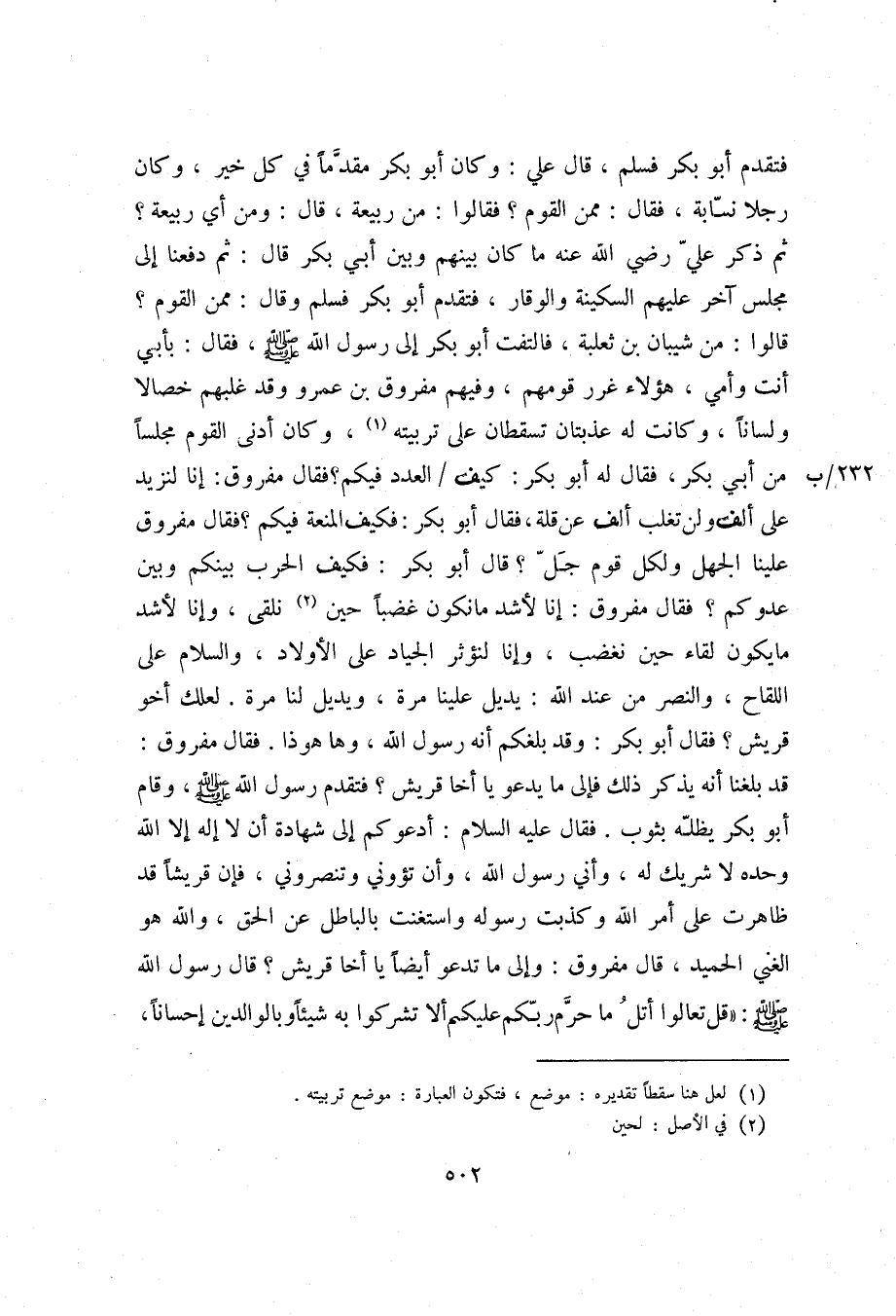 قد بلغنا أنه يذكر ذلك فإلى ما يدعو يا أخا قريش؟ فتقدم رسول الله صلّى الله عليه وسلم، وقام أبو بكر يظلّه بثوب. فقال عليه السلام: أدعوكم إلى شهادة أن لا إله إلا الله وحده لا شريك له، وأني رسول الله، وأن تؤوني وتنصروني. فإن قريشا قد ظاهرت على أمر الله وكذبت رسوله واستغنت بالباطل عن الحق، والله هو الغني الحميد، قال مفروق: وإلى ما تدعو أيضا يا أخا قريش؟ قال رسول الله صلّى الله عليه وسلم: «قُلْ تَعالَوْا أَتْلُ ما حَرَّمَ رَبُّكُمْ عَلَيْكُمْ أَلَّا تُشْرِكُوا بِهِ شَيْئاً وَبِالْوالِدَيْنِ إِحْساناً،