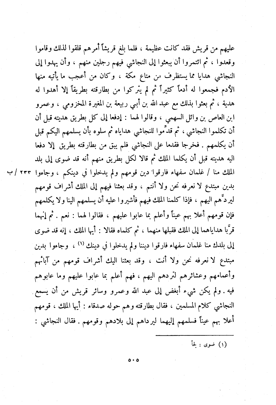عليهم من قريش فقد كانت عظيمة، فلما بلغ قريشا أمرهم قلقوا لذلك وقاموا وقعدوا، ثم ائتمروا أن يبعثوا إلى النجاشي فيهم رجلين منهم، وأن يهدوا إلى النجاشي هدايا مما يستظرف من متاع مكة، وكان من أعجب ما يأتيه منها الأدم فجمعوا له أدما كثيرا ثم لم يتركوا من بطارقته بطريقا إلا أهدوا له هدية، ثم بعثوا بذلك مع عبد الله بن أبي ربيعة بن المغيرة المخزومي، وعمرو ابن العاص بن وائل السهمي، وقالوا لهما: إدفعا إلى كل بطريق هديته قبل أن أن تكلموا النجاشي، ثم قدّموا للنجاشي هداياه ثم سلوه بأن يسلمهم اليكم قبل أن يكلمهم. فخرجا فقدما على النجاشي فلم يبق من بطارقته بطريق إلا دفعا اليه هديته قبل أن يكلما الملك ثم قالا لكل بطريق منهم أنه قد ضوى إلى بلد الملك منا/ غلمان سفهاء فارقوا دين قومهم ولم يدخلوا في دينكم، وجاؤا بدين مبتدع لا نعرفه نحن ولا أنتم، وقد بعثنا فيهم إلى الملك أشراف قومهم ليردّهم اليهم، فإذا كلمنا الملك فيهم فأشيروا عليه أن يسلمهم الينا ولا يكلمهم فإن قومهم أعلا بهم عينا وأعلم بما عابوا عليهم، فقالوا لهما: نعم. ثم إنهما قرّبا هداياهما إلى الملك فقبلها منهما، ثم كلماه فقالا: أيها الملك، إنه قد ضوى إلى بلدك منا غلمان سفهاء فارقوا ديننا ولم يدخلوا في دينك «1» ، وجاؤا بدين مبتدع لا نعرفه نحن ولا أنت، وقد بعثنا اليك أشراف قومهم من آبائهم وأعمامهم وعشائرهم لتردهم اليهم، فهم أعلم بما عابوا عليهم وما عابوهم فيه. ولم يكن شيء أبغض إلى عبد الله وعمرو وسائر قريش من أن يسمع النجاشي كلام المسلمين، فقال بطارقته وهم حوله صدقاء: أيها الملك، قومهم أعلا بهم عينا فسلمهم إليهما ليرداهم إلى بلادهم وقومهم. فقال النجاشي: