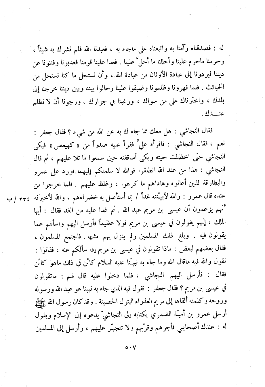 نقول والله فيه ما قال الله وما جاء به نبيّنا عليه السلام كائن في ذلك ما هو كائن فقال: فأرسل اليهم النجاشي، فلما دخلوا عليه قال لهم: ما تقولون في عيسى بن مريم؟ فقال جعفر: نقول فيه الذي جاء به نبينا هو عبد الله ورسوله وروحه وكلمته ألقاها إلى مريم العذراء البتول الحصينة. وقد كان رسول الله صلّى الله عليه وسلم أرسل عمرو بن أميّة الضمري بكتابه إلى النجاشيّ يدعوه إلى الإسلام ويقول له: عندك أصحابي فأجرهم وقرّبهم ولا تتجبّر عليهم، وأرسل إلى المسلمين