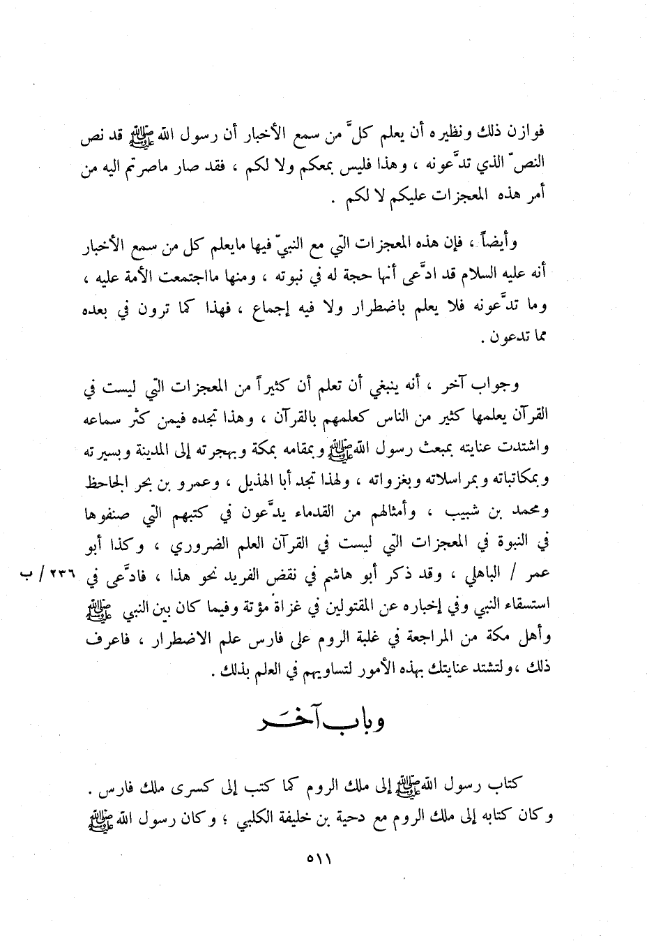 وجواب آخر، أنه ينبغي أن تعلم أن كثيرا من المعجزات التي ليست في القرآن يعلمها كثير من الناس كعلمهم بالقرآن، وهذا تجده فيمن كثر سماعه واشتدت عنايته بمبعث رسول الله صلّى الله عليه وسلم وبمقامه بمكة وبهجرته إلى المدينة وبسيرته وبمكاتباته وبمراسلاته وبغزواته، ولهذا تجد أبا الهذيل، وعمرو بن بحر الجاحظ ومحمد بن شبيب، وأمثالهم من القدماء يدّعون في كتبهم التي صنفوها في النبوة في المعجزات التي ليست في القرآن العلم الضروري، وكذا أبو عمر/ الباهلي، وقد ذكر أبو هاشم في نقض الفريد نحو هذا، فادّعى في استسقاء النبي وفي إخباره عن المقتولين في غزاة مؤتة وفيما كان بين النبي صلّى الله عليه وسلم وأهل مكة من المراجعة في غلبة الروم على فارس علم الاضطرار، فاعرف ذلك، ولتشتد عنايتك بهذه الأمور لتساويهم في العلم بذلك.