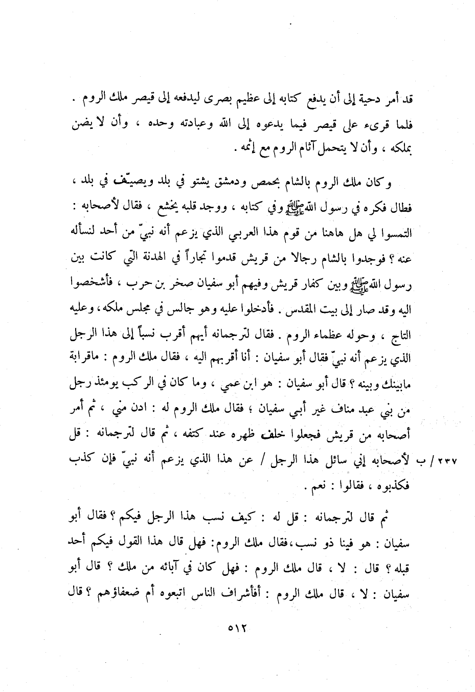 ثم قال لترجمانه: قل له: كيف نسب هذا الرجل فيكم؟ فقال أبو سفيان: هو فينا ذو نسب، فقال ملك الروم: فهل قال هذا القول فيكم أحد قبله؟ قال: لا، قال ملك الروم: فهل كان في آبائه من ملك؟ قال أبو سفيان: لا، قال ملك الروم: أفأشراف الناس اتبعوه أم ضعفاؤهم؟ قال