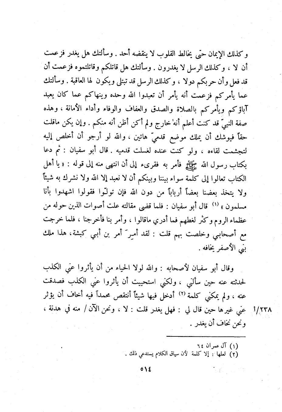 وكذلك الإيمان حتى يخالط القلوب لا ينقضه أحد. وسألتك هل يغدر فزعمت أن لا، وكذلك الرسل لا يغدرون. وسألتك هل قاتلكم وقاتلتموه فزعمت أن قد فعل وأن حربكم دولا، وكذلك الرسل قد تبتلى ويكون لها العاقبة. وسألتك عما يأمركم فزعمت أنه يأمر أن تعبدوا الله وحده وينهاكم عما كان يعبد آباؤكم ويأمركم بالصلاة والصدق والعفاف والوفاء وأداء الأمانة، وهذه صفة النبيّ قد كنت أعلم أنه خارج ولم أكن أظن أنه منكم. وإن يكن ما قلت حقا فيوشك أن يملك موضع قدميّ هاتين، والله لو أرجو أن أخلص إليه لتجشمت لقاءه، ولو كنت عنده لغسلت قدميه. قال أبو سفيان: ثم دعا بكتاب رسول الله صلّى الله عليه وسلم فأمر به فقرىء إلى أن انتهى منه إلى قوله: «يا أَهْلَ الْكِتابِ تَعالَوْا إِلى كَلِمَةٍ سَواءٍ بَيْنَنا وَبَيْنَكُمْ أَلَّا نَعْبُدَ إِلَّا اللَّهَ وَلا نُشْرِكَ بِهِ شَيْئاً وَلا يَتَّخِذَ بَعْضُنا بَعْضاً أَرْباباً مِنْ دُونِ اللَّهِ فَإِنْ تَوَلَّوْا فَقُولُوا اشْهَدُوا بِأَنَّا مُسْلِمُونَ» «1» قال أبو سفيان: فلما قضى مقالته علت أصوات الذين حوله من عظاماء الروم وكثر لغطهم فما أدري ما قالوا، وأمر بنا فأخرجنا، فلما خرجت مع أصحابي وخلصت بهم قلت: لقد أمر أمر بن أبي كبشة، هذا ملك بني الأصفر يخافه.