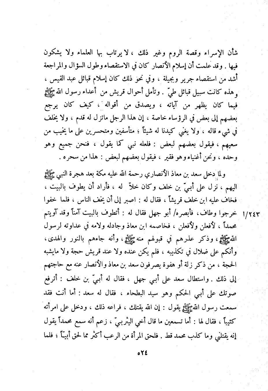 شأن الإسراء وقصة الروم وغير ذلك، لا يرتاب بها العلماء ولا يشكون فيها. وقد علمت أن إسلام الأنصار كان في الاستقصاء وطول السؤال والمراجعة أشد من استقصاء جرير وبجيلة، وفي نحو ذلك كان إسلام قبائل عبد القيس، وهذه كانت سبيل قبائل طيّ. وتأمل أحوال قريش من أعداء رسول الله صلّى الله عليه وسلم فيما كان يظهر من آياته، ويصدق من أقواله، كيف كان يرجع بعضهم إلى بعض في الرؤساء خاصة، إن هذا الرجل ما تزل له قدم، ولا يخلف في شيء قاله، ولا يغني كيدنا له شيئا؛ متأسفين ومتحسرين على ما يخيب من سعيهم، فيقول بعضهم لبعض: فلعله نبي كما يقول، فنحن جميع وهو وحده، ونحن أغنياء وهو فقير، فيقول بعضهم لبعض: هذا من سحره.