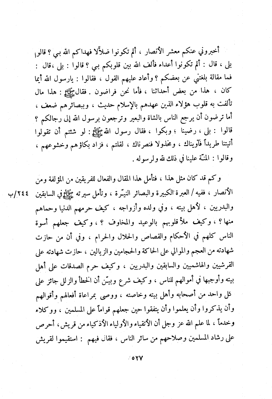 أخبروني عنكم معشر الأنصار، ألم تكونوا ضلّالا فهداكم الله بي؟ قالوا بلى، قال: ألم تكونوا أعداء فألف الله بين قلوبكم بي؟ قالوا: بلى، قال: