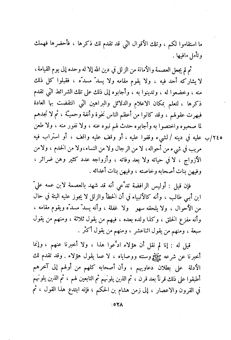 فإن قيل: أو ليس الرافضة تدّعي أنه قد شهد بالعصمة لابن عمه عليّ ابن أبي طالب، وأنه كالأنبياء في أن الخطأ والزلل لا يجوز عليه البتة في حال من الأحوال، ولا يلحقه سهو ولا غفلة، وأنه يسدّ مسدّه ويقوم مقامه، وأنه مفزع الخلق، وكذا ولده بعده، فيهم من يقول ثلاثة، ومنهم من يقول سبعة، ومنهم من يقول اثنا عشر، ومنهم من يقول أكثر.