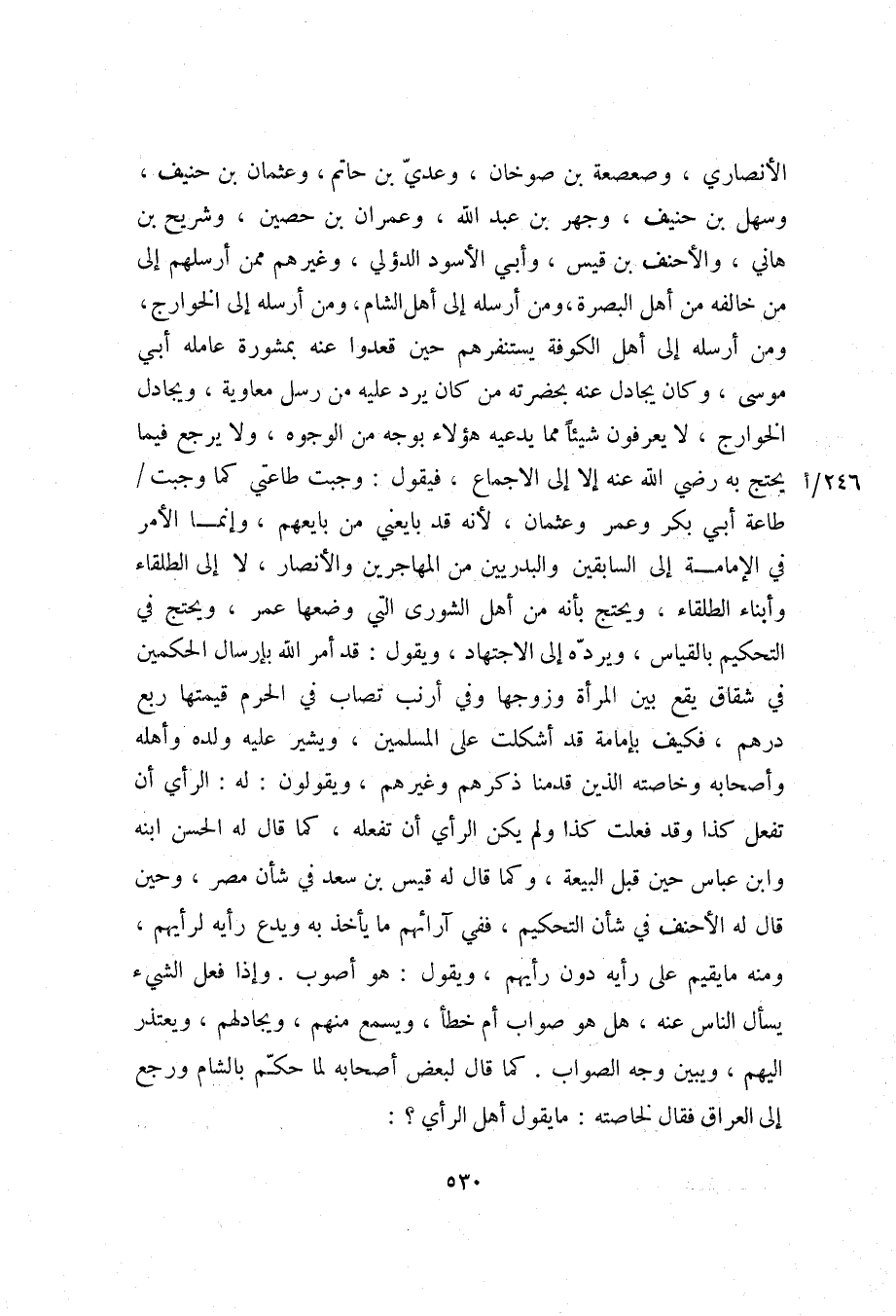 الأنصاري، وصعصعة بن صوخان، وعديّ بن حاتم، وعثمان بن حنيف، وسهل بن حنيف، وجهر بن عبد الله، وعمران بن حصين، وشريح بن هاني، والأحنف بن قيس، وأبي الأسود الدؤلي، وغيرهم ممن أرسلهم إلى من خالفه من أهل البصرة، ومن أرسله إلى أهل الشام، ومن أرسله إلى الخوارج، ومن أرسله إلى أهل الكوفة يستنفرهم حين قعدوا عنه بمشورة عامله أبي موسى، وكان يجادل عنه بحضرته من كان يرد عليه من رسل معاوية، ويجادل الخوارج، لا يعرفون شيئا مما يدعيه هؤلاء بوجه من الوجوه، ولا يرجع فيما يحتج به رضي الله عنه إلا إلى الاجماع، فيقول: وجبت طاعتي كما وجبت/ طاعة أبي بكر وعمر وعثمان، لأنه قد بايعني من بايعهم، وإنما الأمر في الإمامة إلى السابقين والبدريين من المهاجرين والأنصار، لا إلى الطلقاء وأبناء الطلقاء، ويحتج بأنه من أهل الشورى التي وضعها عمر، ويحتج في التحكيم بالقياس، ويردّه إلى الاجتهاد، ويقول: قد أمر الله بإرسال الحكمين في شقاق يقع بين المرأة وزوجها وفي أرنب تصاب في الحرم قيمتها ربع درهم، فكيف بإمامة قد أشكلت على المسلمين، ويشير عليه ولده وأهله وأصحابه وخاصته الذين قدمنا ذكرهم وغيرهم، ويقولون: له: الرأي أن تفعل كذا وقد فعلت كذا ولم يكن الرأي أن تفعله، كما قال له الحسن ابنه وابن عباس حين قبل البيعة، وكما قال له قيس بن سعد في شأن مصر، وحين قال له الأحنف في شأن التحكيم، ففي آرائهم ما يأخذ به ويدع رأيه لرأيهم، ومنه ما يقيم على رأيه دون رأيهم، ويقول: هو أصوب. وإذا فعل الشيء يسأل الناس عنه، هل هو صواب أم خطأ، ويسمع منهم، ويجادلهم، ويعتذر اليهم، ويبين وجه الصواب. كما قال لبعض أصحابه لما حكّم بالشام ورجع إلى العراق فقال لخاصته: ما يقول أهل الرأي؟:
