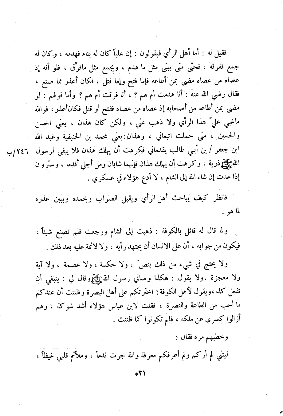 فقيل له: أما أهل الرأي فيقولون: إن عليا كان له بناء فهدمه، وكان له جمع ففرقه، فحتى متى يا بنى مثل ما هدم، ويجمع مثل ما فرّق، فلو أنه إذ عصاه من عصاه مضى بمن أطاعه فإما فتح وإما قتل، فكان أعذر مما صنع؛ فقال رضي الله عنه: أنا هدمت أم هم؟، أنا فرقت أم هم؟ وأما قولهم: لو مضى بمن أطاعه من أصحابه إذ عصاه من عصاه ففتح أو قتل فكان أعذر، فو الله ماغبي عليّ هذا الرأي ولا ذهب عني، ولكن كان هذان، يعني الحسن والحسين، متى حملت اتبعاني، وهذان: يعني محمد بن الحنيفية وعبد الله ابن جعفر/ بن أبي طالب يقدماني فكرهت أن يهلك هذان فلا يبقى لرسول الله صلّى الله عليه وسلم ذرية، وكرهت أن يهلك هذان فإنهما شابان ومن أجلي أقدما، وسترون إذا عدت إن شاء الله إلى الشام، لا أدع هؤلاء في عسكري.