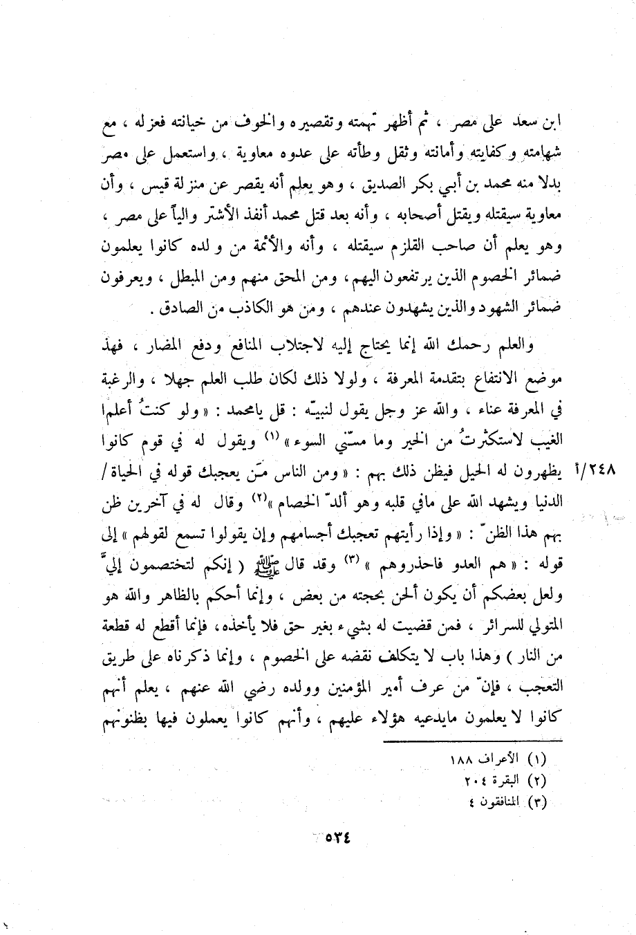 والعلم رحمك الله إنما يحتاج إليه لاجتلاب المنافع ودفع المضار، فهذ موضع الانتفاع بتقدمة المعرفة، ولولا ذلك لكان طلب العلم جهلا، والرغبة في المعرفة عناء، والله عز وجل يقول لنبيّه: قل يا محمد: «وَلَوْ كُنْتُ أَعْلَمُ الْغَيْبَ لَاسْتَكْثَرْتُ مِنَ الْخَيْرِ وَما مَسَّنِيَ السُّوءُ» «1» ويقول له في قوم كانوا يظهرون له الحيل فيظن ذلك بهم: «وَمِنَ النَّاسِ مَنْ يُعْجِبُكَ قَوْلُهُ فِي الْحَياةِ الدُّنْيا وَيُشْهِدُ اللَّهَ عَلى ما فِي قَلْبِهِ وَهُوَ أَلَدُّ الْخِصامِ» «2» وقال له في آخرين ظن بهم هذا الظنّ: «وَإِذا رَأَيْتَهُمْ تُعْجِبُكَ أَجْسامُهُمْ وَإِنْ يَقُولُوا تَسْمَعْ لِقَوْلِهِمْ» إلى قوله: «هُمُ الْعَدُوُّ فَاحْذَرْهُمْ» «3» وقد قال صلّى الله عليه وسلم (إنكم لتختصمون إليّ ولعل بعضكم أن يكون ألحن بحجته من بعض، وإنما أحكم بالظاهر والله هو المتولي للسرائر، فمن قضيت له بشيء بغير حق فلا يأخذه، فإنما أقطع له قطعة من النار) وهذا باب لا يتكلف نقضه على الخصوم، وإنما ذكرناه على طريق التعجب، فإنّ من عرف أمير المؤمنين وولده رضي الله عنهم، يعلم أنهم كانوا لا يعلمون ما يدعيه هؤلاء عليهم، وأنهم كانوا يعملون فيها بظنونهم