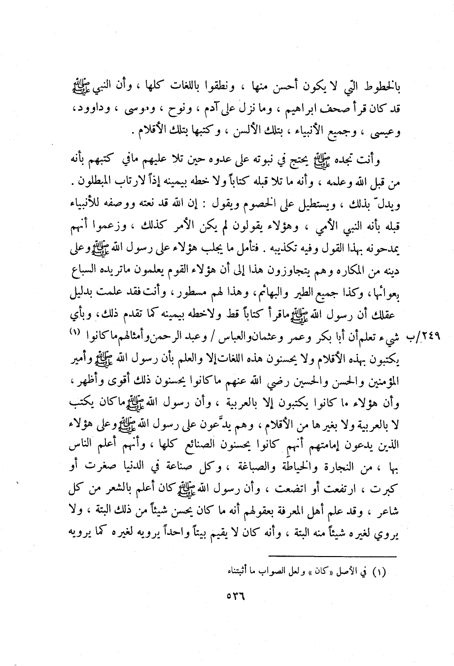 ويدلّ بذلك، ويستطيل على الخصوم ويقول: إن الله قد نعته ووصفه للأنبياء قبله بأنه النبي الأمي، وهؤلاء يقولون لم يكن الأمر كذلك، وزعموا أنهم يمدحونه بهذا القول وفيه تكذيبه. فتأمل ما يجلب هؤلاء على رسول الله صلّى الله عليه وسلم وعلى دينه من المكاره وهم يتجاوزون هذا إلى أن هؤلاء القوم يعلمون ما تريده السباع بعوائها، وكذا جميع الطير والبهائم، وهذا لهم مسطور، وأنت فقد علمت بدليل عقلك أن رسول الله صلّى الله عليه وسلم ما قرأ كتابا قط ولاخطه بيمينه كما تقدم ذلك، وبأي شيء تعلم أن أبا بكر وعمر وعثمان والعباس وعبد الرحمن وأمثالهم ما كانوا «1» يكتبون بهذه الأقلام ولا يحسنون هذه اللغات إلا والعلم بأن رسول الله صلّى الله عليه وسلم وأمير المؤمنين والحسن والحسين رضي الله عنهم ما كانوا يحسنون ذلك أقوى وأظهر.