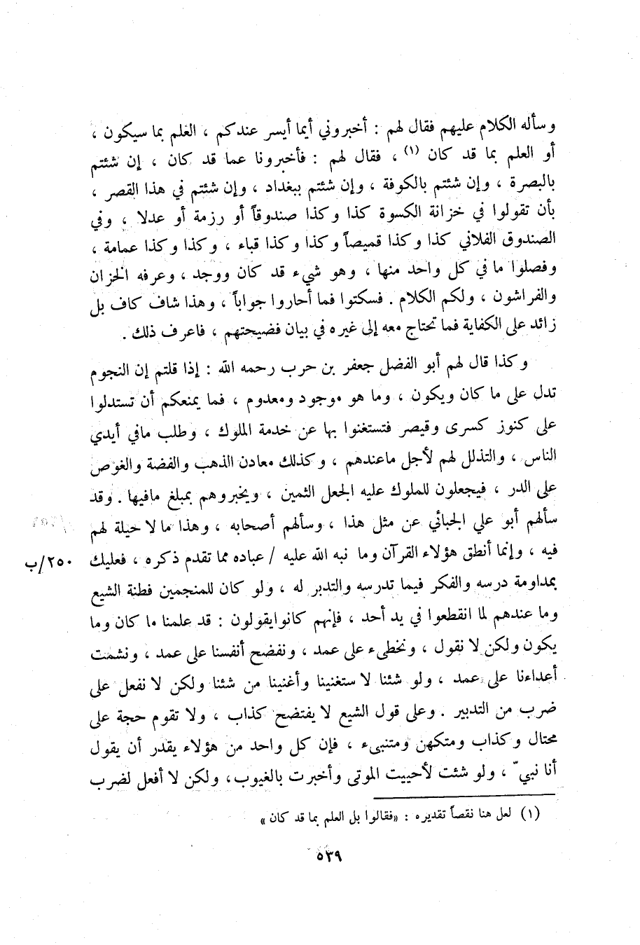 وسأله الكلام عليهم فقال لهم: أخبروني أيما أيسر عندكم، العلم بما سيكون، أو العلم بما قد كان «1» ، فقال لهم: فأخبرونا عما قد كان، إن شئتم بالبصرة، وإن شئتم بالكوفة، وإن شئتم ببغداد، وإن شئتم في هذا القصر، بأن تقولوا في خزانة الكسوة كذا وكذا صندوقا أو رزمة أو عدلا، وفي الصندوق الفلاني كذا وكذا قميصا وكذا وكذا قباء، وكذا وكذا عمامة، وفصلوا ما في كل واحد منها، وهو شيء قد كان ووجد، وعرفه الخزان والفراشون، ولكم الكلام. فسكتوا فما أحاروا جوابا، وهذا شاف كاف بل زائد على الكفاية فما تحتاج معه إلى غيره في بيان فضيحتهم، فاعرف ذلك.