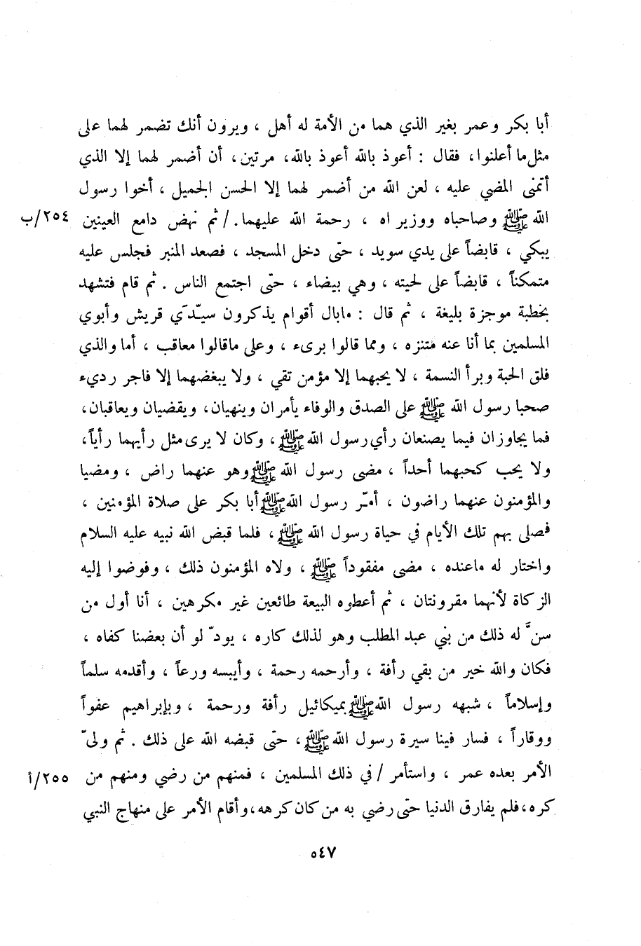 أبا بكر وعمر بغير الذي هما من الأمة له أهل، ويرون أنك تضمر لهما على مثل ما أعلنوا، فقال: أعوذ بالله أعوذ بالله، مرتين، أن أضمر لهما إلا الذي أتمنى المضي عليه، لعن الله من أضمر لهما إلا الحسن الجميل، أخوا رسول الله صلّى الله عليه وسلم وصاحباه ووزيراه، رحمة الله عليهما. / ثم نهض دامع العينين يبكي، قابضا على يدي سويد، حتى دخل المسجد، فصعد المنبر فجلس عليه متمكنا، قابضا على لحيته، وهي بيضاء، حتى اجتمع الناس. ثم قام فتشهد بخطبة موجزة بليغة، ثم قال: ما بال أقوام يذكرون سيّدي قريش وأبوي المسلمين بما أنا عنه متنزه، ومما قالوا برىء، وعلى ما قالوا معاقب، أما والذي فلق الحبة وبرأ النسمة، لا يحبهما إلا مؤمن تقي، ولا يبغضهما إلا فاجر رديء صحبا رسول الله صلّى الله عليه وسلم على الصدق والوفاء يأمران وينهيان، ويقضيان ويعاقبان، فما يجاوزان فيما يصنعان رأي رسول الله صلّى الله عليه وسلم، وكان لا يرى مثل رأيهما رأيا، ولا يحب كحبهما أحدا، مضى رسول الله صلّى الله عليه وسلم وهو عنهما راض، ومضيا والمؤمنون عنهما راضون، أمّر رسول الله صلّى الله عليه وسلم أبا بكر على صلاة المؤمنين، فصلى بهم تلك الأيام في حياة رسول الله صلّى الله عليه وسلم، فلما قبض الله نبيه عليه السلام واختار له ما عنده، مضى مفقودا صلّى الله عليه وسلم، ولاه المؤمنون ذلك، وفوضوا إليه الزكاة لأنهما مقرونتان، ثم أعطوه البيعة طائعين غير مكرهين، أنا أول من سنّ له ذلك من بني عبد المطلب وهو لذلك كاره، يودّ لو أن بعضنا كفاه، فكان والله خير من بقي رأفة، وأرحمه رحمة، وأيبسه ورعا، وأقدمه سلما وإسلاما، شبهه رسول الله صلّى الله عليه وسلم بميكائيل رأفة ورحمة، وبإبراهيم عفوا ووقارا، فسار فينا سيرة رسول الله صلّى الله عليه وسلم، حتى قبضه الله على ذلك. ثم ولىّ الأمر بعده عمر، واستأمر/ في ذلك المسلمين، فمنهم من رضي ومنهم من كره، فلم يفارق الدنيا حتى رضي به من كان كرهه، وأقام الأمر على منهاج النبي