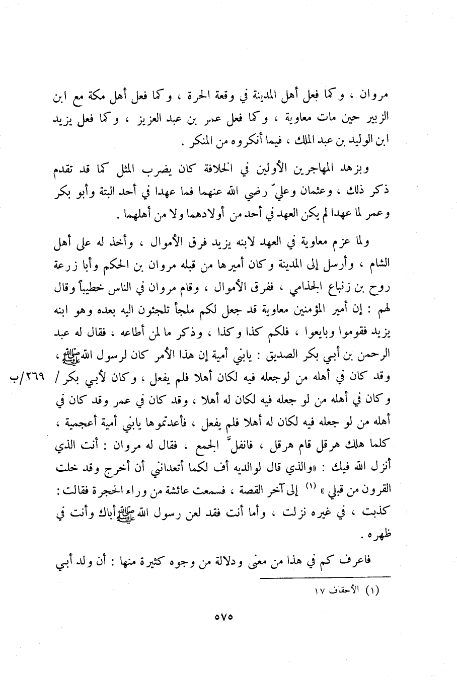 ولما عزم معاوية في العهد لابنه يزيد فرق الأموال، وأخذ له على أهل الشام، وأرسل إلى المدينة وكان أميرها من قبله مروان بن الحكم وأبا زرعة روح بن زنباع الجذامي، ففرق الأموال، وقام مروان في الناس خطيبا وقال لهم: إن أمير المؤمنين معاوية قد جعل لكم ملجأ تلجئون اليه بعده وهو ابنه يزيد فقوموا وبايعوا، فلكم كذا وكذا، وذكر ما لمن أطاعه، فقال له عبد الرحمن بن أبي بكر الصديق: يا بني أمية إن هذا الأمر كان لرسول الله صلّى الله عليه وسلم، وقد كان في أهله من لو جعله فيه لكان أهلا فلم يفعل، وكان لأبي بكر/ وكان في أهله من لو جعله فيه لكان له أهلا، وقد كان في عمر وقد كان في أهله من لو جعله فيه لكان له أهلا فلم يفعل، فأعدتموها يا بني أمية أعجمية، كلما هلك هرقل قام هرقل، فانفلّ الجمع، فقال له مروان: أنت الذي أنزل الله فيك: «وَالَّذِي قالَ لِوالِدَيْهِ أُفٍّ لَكُما أَتَعِدانِنِي أَنْ أُخْرَجَ وَقَدْ خَلَتِ الْقُرُونُ مِنْ قَبْلِي» «1» إلى آخر القصة، فسمعت عائشة من وراء الحجرة فقالت: