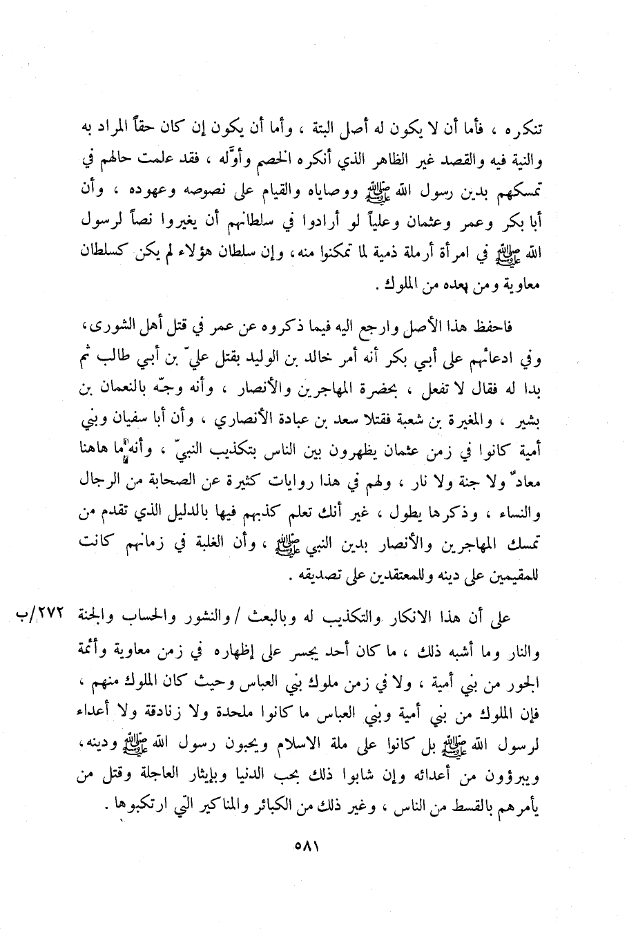 تنكره، فأما أن لا يكون له أصل البتة، وأما أن يكون إن كان حقا المراد به والنية فيه والقصد غير الظاهر الذي أنكره الخصم وأوّله، فقد علمت حالهم في تمسكهم بدين رسول الله صلّى الله عليه وسلم ووصاياه والقيام على نصوصه وعهوده، وأن أبا بكر وعمر وعثمان وعليا لو أرادوا في سلطانهم أن يغيروا نصا لرسول الله صلّى الله عليه وسلم في امرأة أرملة ذمية لما تمكنوا منه، وإن سلطان هؤلاء لم يكن كسلطان معاوية ومن بعده من الملوك.