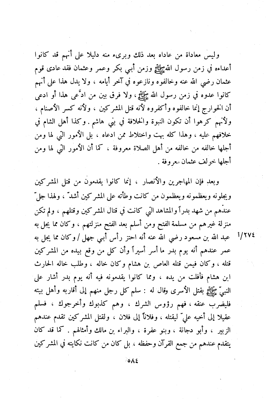 وليس معاداة من عاداه بعد ذلك وبرىء منه دليلا على أنهم قد كانوا أعداءه في زمن رسول الله صلّى الله عليه وسلم وزمن أبي بكر وعمر وعثمان فقد عادى قوم عثمان رضي الله عنه وخالفوه ونازعوه في آخر أيامه، ولا يدل هذا على أنهم كانوا عدوه في زمن رسول الله صلّى الله عليه وسلم، ولا فرق بين من ادّعى هذا أو ادعى أن الخوارج إنما خالفوه وأكفروه لأنه قتل المشركين، ولأنه كسر الأصنام، ولأنهم كرهوا أن تكون النبوة والخلافة في بني هاشم. وكذا أهل الشام في خلافهم عليه، وهذا كله بهت واختلاط ممن ادعاه، بل الأمور التي لها ومن أجلها خالفه من خالفه من أهل الصلاة معروفة، كما أن الأمور التي لها ومن أجلها خولف عثمان معروفة.
