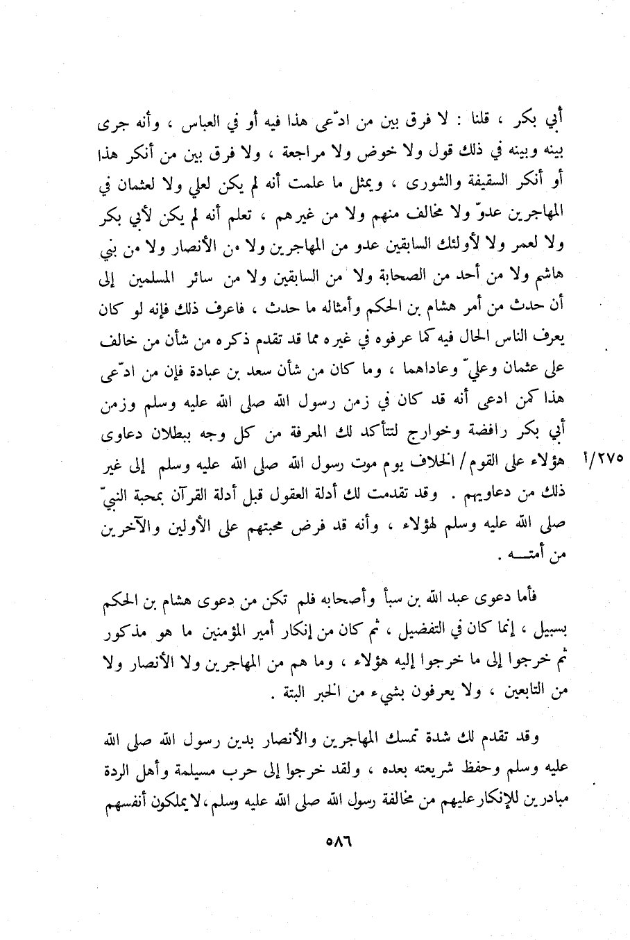 أبي بكر، قلنا: لا فرق بين من ادّعى هذا فيه أو في العباس، وأنه جرى بينه وبينه في ذلك قول ولا خوض ولا مراجعة، ولا فرق بين من أنكر هذا أو أنكر السقيفة والشورى، ويمثل ما علمت أنه لم يكن لعلي ولا لعثمان في المهاجرين عدوّ ولا مخالف منهم ولا من غيرهم، تعلم أنه لم يكن لأبي بكر ولا لعمر ولا لأولئك السابقين عدو من المهاجرين ولا من الأنصار ولا من بني هاشم ولا من أحد من الصحابة ولا من السابقين ولا من سائر المسلمين إلى أن حدث من أمر هشام بن الحكم وأمثاله ما حدث، فاعرف ذلك فإنه لو كان يعرف الناس الحال فيه كما عرفوه في غيره مما قد تقدم ذكره من شأن من خالف على عثمان وعليّ وعاداهما، وما كان من شأن سعد بن عبادة فإن من ادّعى هذا كمن ادعى أنه قد كان في زمن رسول الله صلّى الله عليه وسلم وزمن أبي بكر رافضة وخوارج لتتأكد لك المعرفة من كل وجه ببطلان دعاوى هؤلاء على القوم/ الخلاف يوم موت رسول الله صلّى الله عليه وسلم إلى غير ذلك من دعاويهم. وقد تقدمت لك أدلة العقول قبل أدلة القرآن بمحبة النبيّ صلّى الله عليه وسلم لهؤلاء، وأنه قد فرض محبتهم على الأولين والآخرين من أمته.