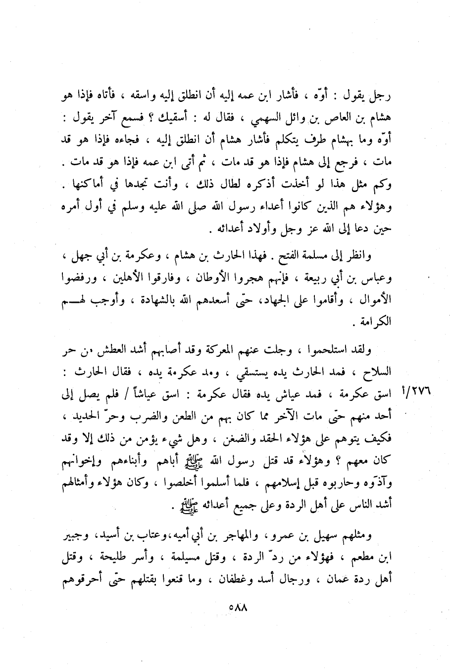 اسق عكرمة، فمد عياش يده فقال عكرمة: اسق عياشا/ فلم يصل إلى أحد منهم حتى مات الآخر مما كان بهم من الطعن والضرب وحرّ الحديد، فكيف يتوهم على هؤلاء الحقد والضغن، وهل شيء يؤمن من ذلك إلا وقد كان معهم؟ وهؤلاء قد قتل رسول الله صلّى الله عليه وسلم أباهم وأبناءهم وإخوانهم وآذوه وحاربوه قبل إسلامهم، فلما أسلموا أخلصوا، وكان هؤلاء وأمثالهم أشد الناس على أهل الردة وعلى جميع أعدائه صلّى الله عليه وسلم.