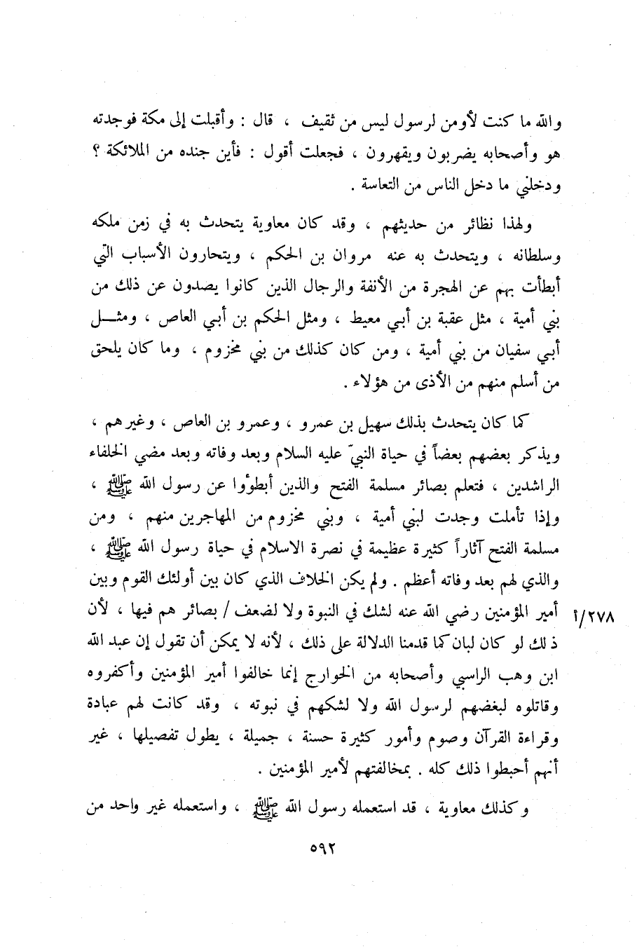 كما كان يتحدث بذلك سهيل بن عمرو، وعمرو بن العاص، وغيرهم، ويذكر بعضهم بعضا في حياة النبيّ عليه السلام وبعد وفاته وبعد مضي الخلفاء الراشدين، فتعلم بصائر مسلمة الفتح والذين أبطؤوا عن رسول الله صلّى الله عليه وسلم، وإذا تأملت وجدت لبني أمية، وبني مخزوم من المهاجرين منهم، ومن مسلمة الفتح آثارا كثيرة عظيمة في نصرة الاسلام في حياة رسول الله صلّى الله عليه وسلم، والذي لهم بعد وفاته أعظم. ولم يكن الخلاف الذي كان بين أولئك القوم وبين أمير المؤمنين رضي الله عنه لشك في النبوة ولا لضعف/ بصائر هم فيها، لأن ذلك لو كان لبان كما قدمنا الدلالة على ذلك، لأنه لا يمكن أن تقول إن عبد الله ابن وهب الراسبي وأصحابه من الخوارج إنما خالفوا أمير المؤمنين وأكفروه وقاتلوه لبغضهم لرسول الله ولا لشكهم في نبوته، وقد كانت لهم عبادة وقراءة القرآن وصوم وأمور كثيرة حسنة، جميلة، يطول تفصيلها، غير أنهم أحبطوا ذلك كله. بمخالفتهم لأمير المؤمنين.