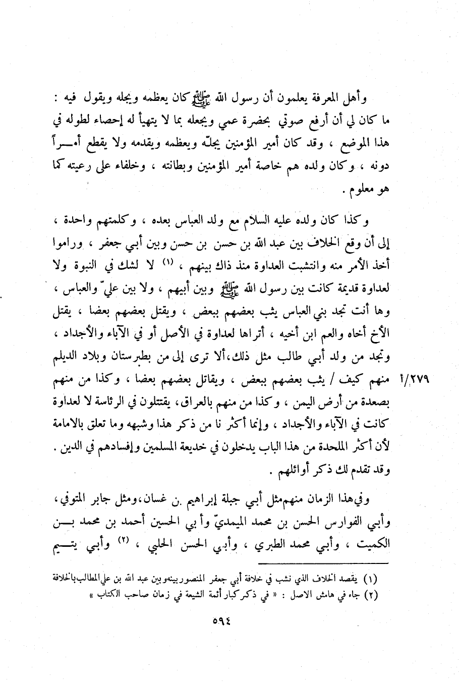 وكذا كان ولده عليه السلام مع ولد العباس بعده، وكلمتهم واحدة، إلى أن وقع الخلاف بين عبد الله بن حسن بن حسن وبين أبي جعفر، وراموا أخذ الأمر منه وانتشبت العداوة منذ ذاك بينهم، «1» لا لشك في النبوة ولا لعداوة قديمة كانت بين رسول الله صلّى الله عليه وسلم وبين أبيهم، ولا بين عليّ والعباس، وها أنت تجد بني العباس يثب بعضهم ببعض، ويقتل بعضهم بعضا، يقتل الأخ أخاه والعم ابن أخيه، أتراها لعداوة في الأصل أو في الآباء والأجداد، وتجد من ولد أبي طالب مثل ذلك، ألا ترى إلى من بطبرستان وبلاد الديلم منهم كيف/ يثب بعضهم ببعض، ويقاتل بعضهم بعضا، وكذا من منهم بصعدة من أرض اليمن، وكذا من منهم بالعراق، يقتتلون في الرئاسة لا لعداوة كانت في الآباء والأجداد، وإنما أكثرنا من ذكر هذا وشبهه وما تعلق بالامامة لأن أكثر الملحدة من هذا الباب يدخلون في خديعة المسلمين وإفسادهم في الدين.