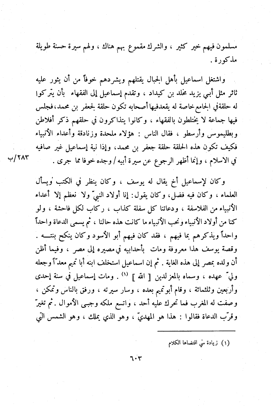 واشتغل اسماعيل بأهل الجبال يقتلهم ويشردهم خوفا من أن يثور عليه ثائر مثل أبي يزيد مخلد بن كيداد، وتقدم إسماعيل إلى الفقهاء بأن يتركوا له حلقة في الجامع خاصة له يقعد فيها أصحابه تكون حلقة لجعفر بن محمد، فجلس فيها جماعة لا يختلطون بالفقهاء، وكانوا يتذاكرون في حلقهم ذكر أفلاطن وبطليموس وأرسطو، فقال الناس: هؤلاء ملحدة وزنادقة وأعداء الأنبياء فكيف تكون هذه الحلقة حلقة جعفر بن محمد، وإذا نية إسماعيل غير صافيه في الاسلام، وإنما أظهر الرجوع عن سيرة أبيه/ وجده خوفا مما جرى.