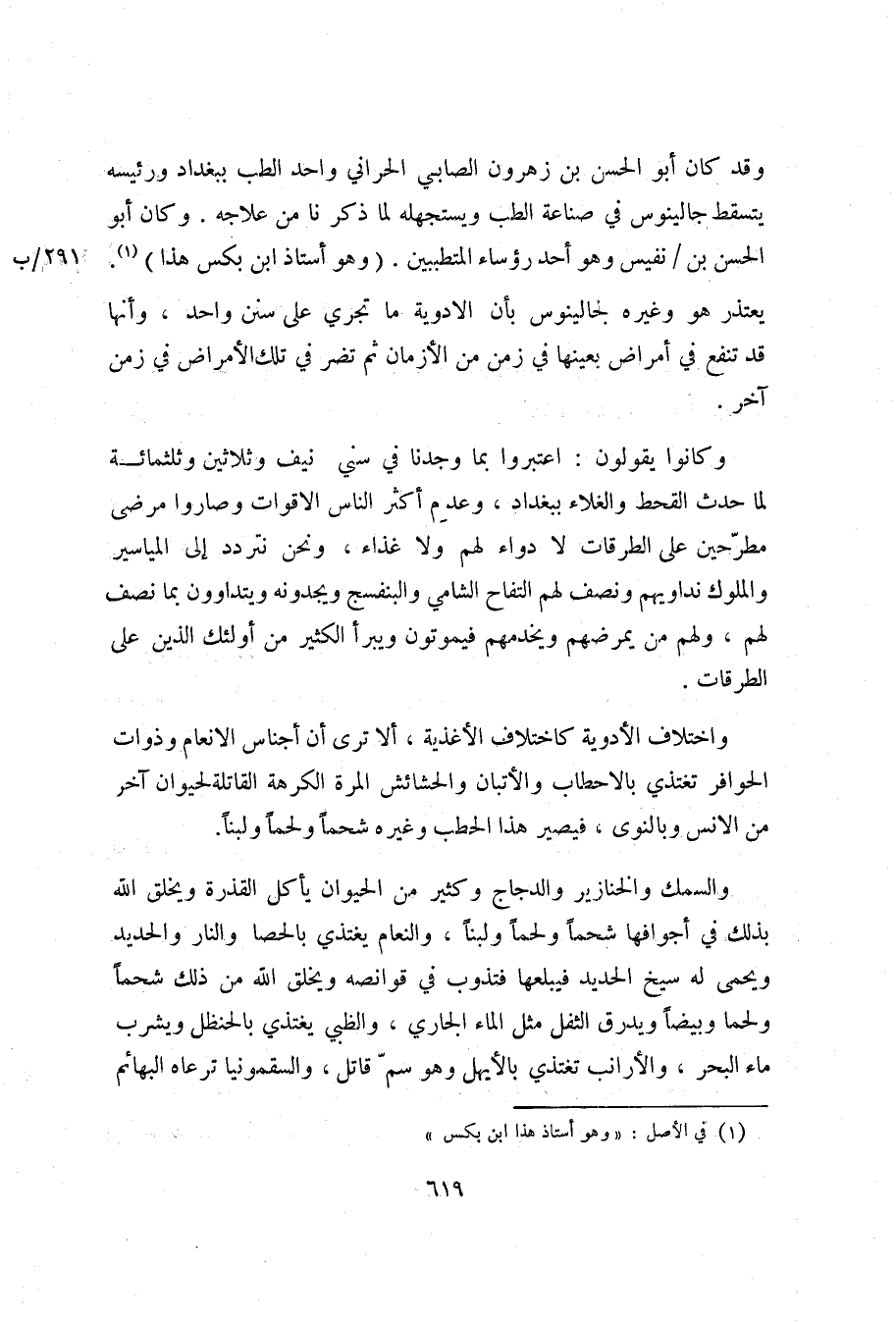 وقد كان أبو الحسن بن زهرون الصابي الحراني واحد الطب ببغداد ورئيسه يتسقط جالينوس في صناعة الطب ويستجهله لما ذكرنا من علاجه. وكان أبو الحسن بن/ نفيس وهو أحد رؤساء المتطببين. (وهو أستاذ ابن بكس هذا) «1» .