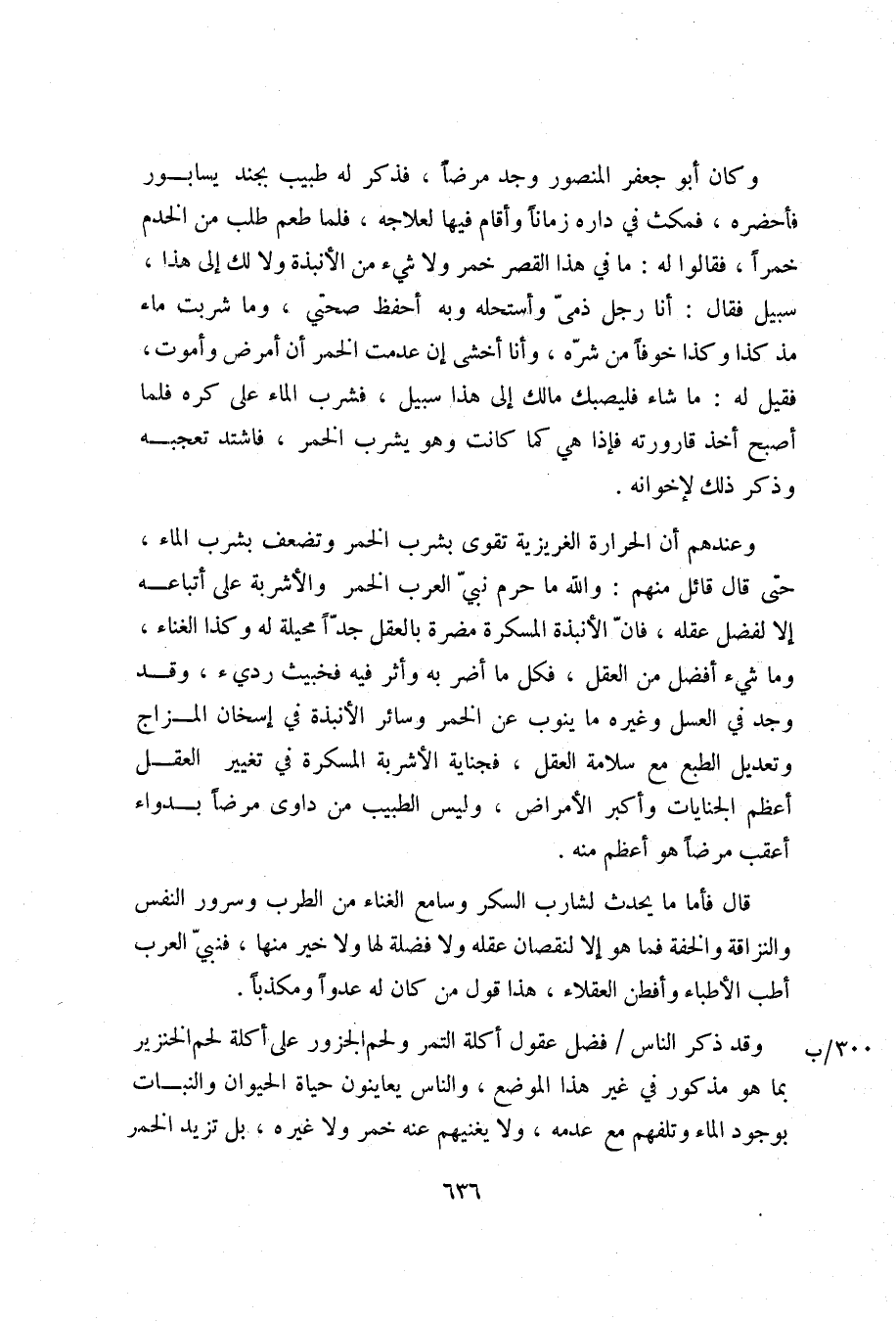 وعندهم أن الحرارة الغريزية تقوى بشرب الخمر وتضعف بشرب الماء، حتى قال قائل منهم: والله ما حرم نبيّ العرب الخمر والأشربة على أتباعه إلا لفضل عقله، فانّ الأنبذة المسكرة مضرة بالعقل جدّا محيلة له وكذا الغناء، وما شيء أفضل من العقل، فكل ما أضر به وأثر فيه فخبيث رديء، وقد وجد في العسل وغيره ما ينوب عن الخمر وسائر الأنبذة في إسخان المزاج وتعديل الطبع مع سلامة العقل، فجناية الأشربة المسكرة في تغيير العقل أعظم الجنايات وأكبر الأمراض، وليس الطبيب من داوى مرضا بدواء أعقب مرضا هو أعظم منه.