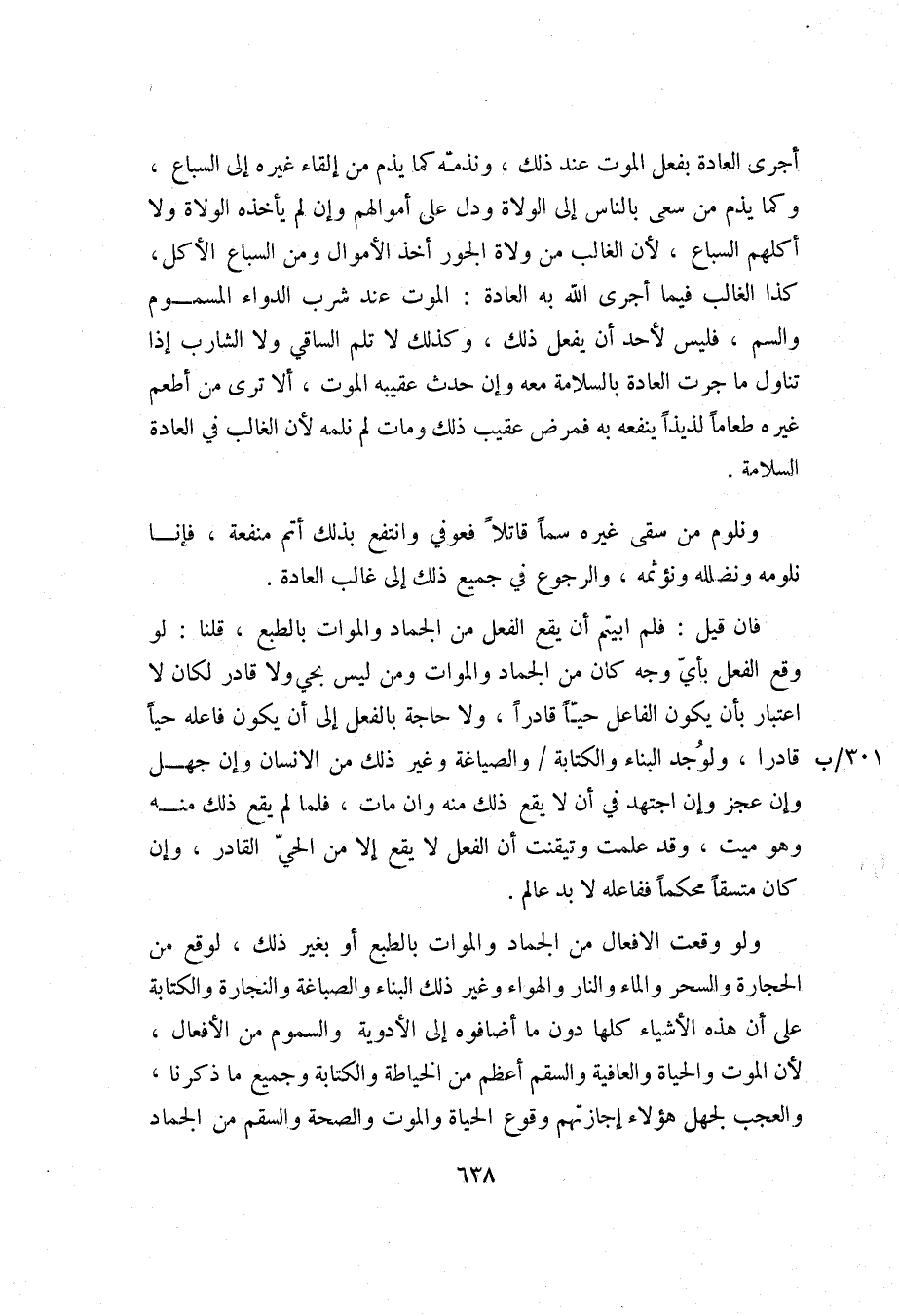 أجرى العادة بفعل الموت عند ذلك، ونذمّه كما يذم من إلقاء غيره إلى السباع، وكما يذم من سعى بالناس إلى الولاة ودل على أموالهم وإن لم يأخذه الولاة ولا أكلهم السباع، لأن الغالب من ولاة الجور أخذ الأموال ومن السباع الأكل، كذا الغالب فيما أجرى الله به العادة: الموت عند شرب الدواء المسموم والسم، فليس لأحد أن يفعل ذلك، وكذلك لا تلم الساقي ولا الشارب إذا تناول ما جرت العادة بالسلامة معه وإن حدث عقيبه الموت، ألا ترى من أطعم غيره طعاما لذيذا ينفعه به فمرض عقيب ذلك ومات لم نلمه لأن الغالب في العادة السلامة.