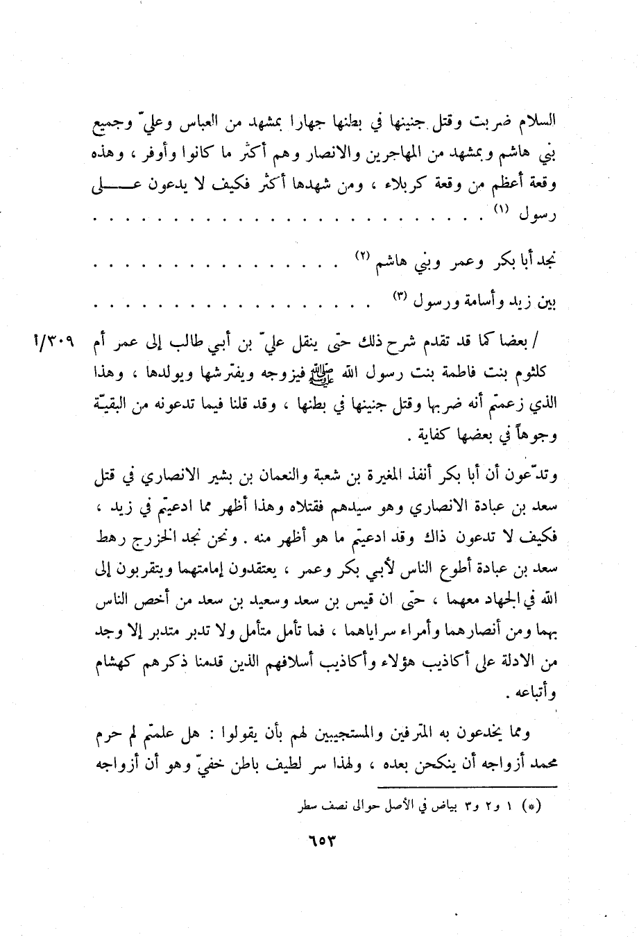/ بعضا كما قد تقدم شرح ذلك حتى ينقل عليّ بن أبي طالب إلى عمر أم كلثوم بنت فاطمة بنت رسول الله صلّى الله عليه وسلم فيزوجه ويفترشها ويولدها، وهذا الذي زعمتم أنه ضربها وقتل جنينها في بطنها، وقد قلنا فيما تدعونه من البقيّة وجوها في بعضها كفاية.