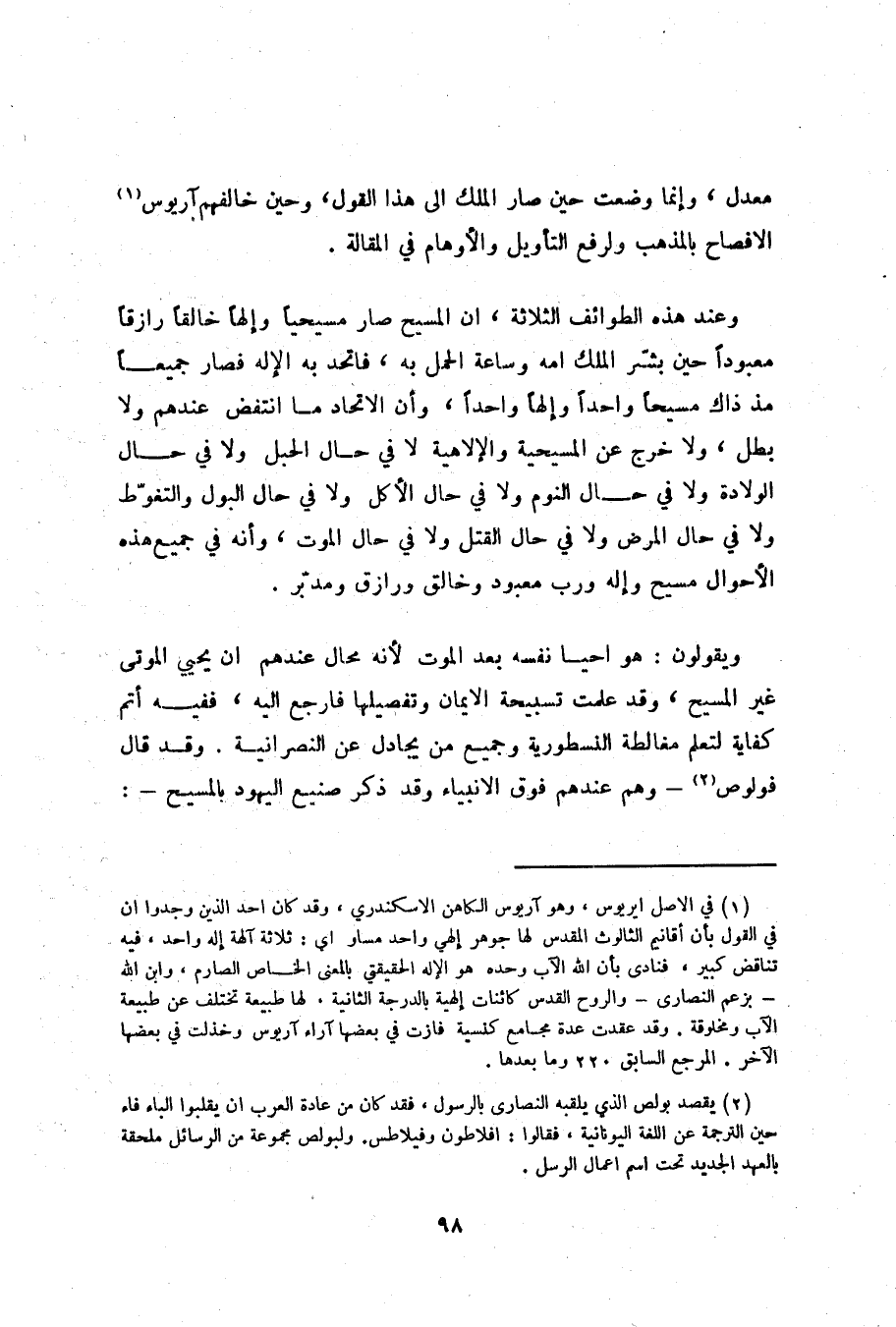 (1) في الاصل ايريوس، وهو آريوس الكاهن الاسكندري، وقد كان احد الذين وجدوا ان في القول بأن أقانيم الثالوث المقدس لها جوهر إلهي واحد مساو اي: ثلاثة آلهة إله واحد، فيه تناقض كبير، فنادى بأن الله الآب وحده هو الإله الحقيقي بالمعنى الخاص الصارم، وابن الله- بزعم النصارى- والروح القدس كائنات إلهية بالدرجة الثانية، لها طبيعة تختلف عن طبيعة الآب ومخلوقة. وقد عقدت عدة مجامع كنسية فازت في بعضها آراء آريوس وخذلت في بعضها الآخر. المرجع السابق 220 وما بعدها.