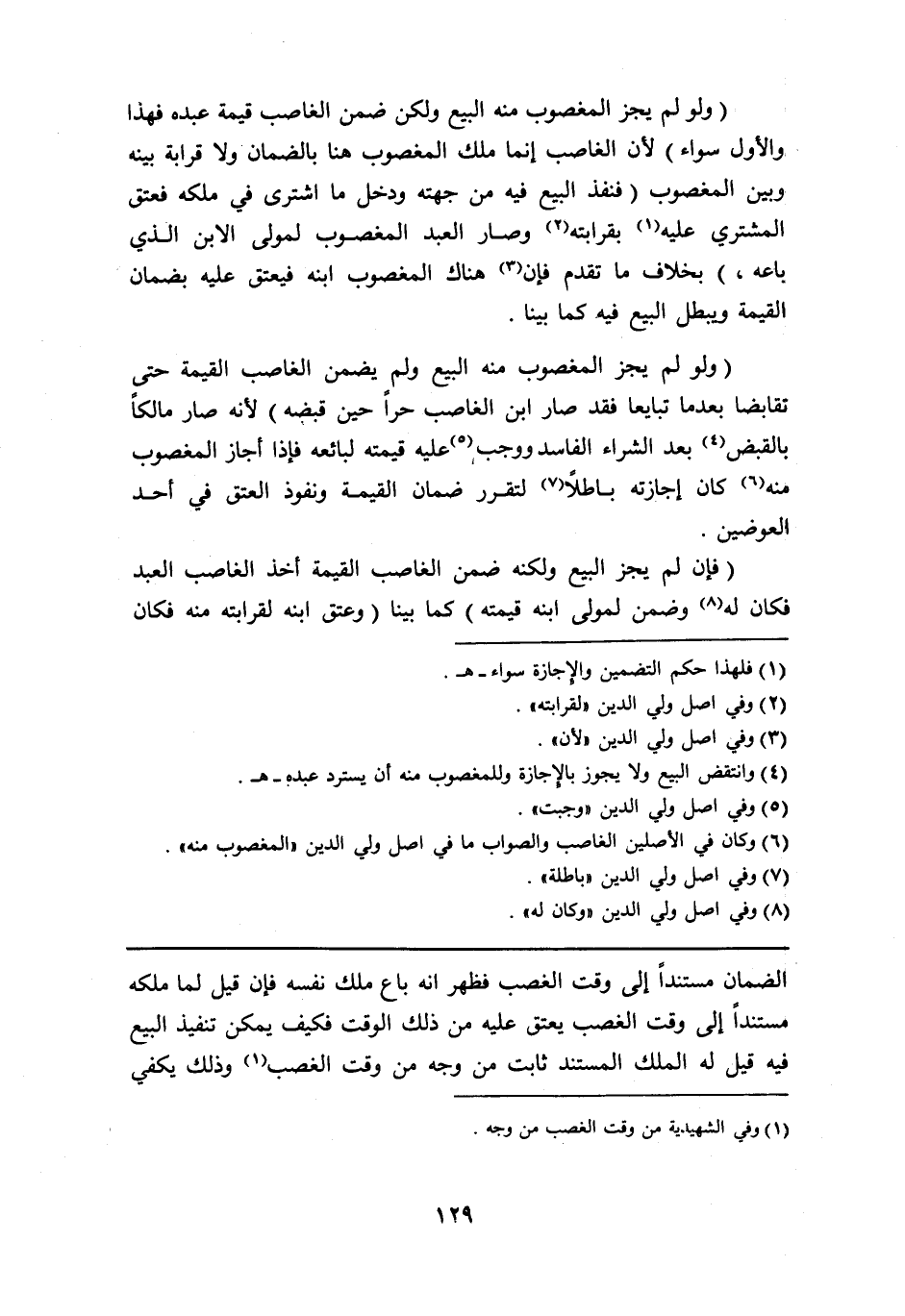 ـــــــــــــــــــــــــــــQالضَّمَان مستنداإلى وَقت الْغَصْب فَظهر انه بَاعَ ملك نَفسه فَإِن قيل لما ملكه مُسْتَندا إِلَى وَقت الْغَصْب يعْتق عَلَيْهِ من ذَلِك الْوَقْت فَكيف يُمكن تَنْفِيذ البيع فِيهِ قيل لَهُ الْملك الْمُسْتَند ثَابت من وَجه من وَقت الْغَصْب وَذَلِكَ يَكْفِي