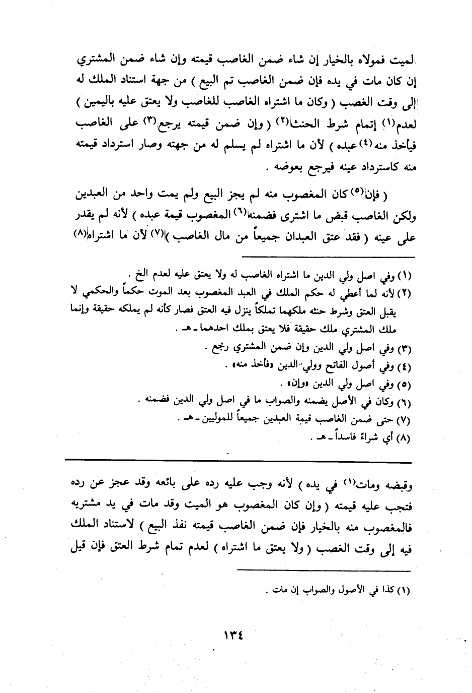لمَيت فمولاه بِالْخِيَارِ إِن شَاءَ ضمن الْغَاصِب قِيمَته وَإِن شَاءَ ضمن المُشْتَرِي إِن كَانَ مَاتَ فِي يَده فَإِن ضمن الْغَاصِب تمّ البيع من جِهَة استناد الْملك لَهُ إِلَى وَقت الْغَصْب وَكَانَ مَا اشْتَرَاهُ الْغَاصِب للْغَاصِب وَلَا يعْتق عَلَيْهِ بِالْيَمِينِ لعدم إتْمَام شَرط الْحِنْث وَإِن ضمن قِيمَته يرجع على الْغَاصِب فَيَأْخُذ مِنْهُ عَبده لِأَن مَا اشْتَرَاهُ لم يسلم لَهُ من جِهَته وَصَارَ اسْتِرْدَاد قِيمَته مِنْهُ كاسترداد عينه فَيرجع بعوضه