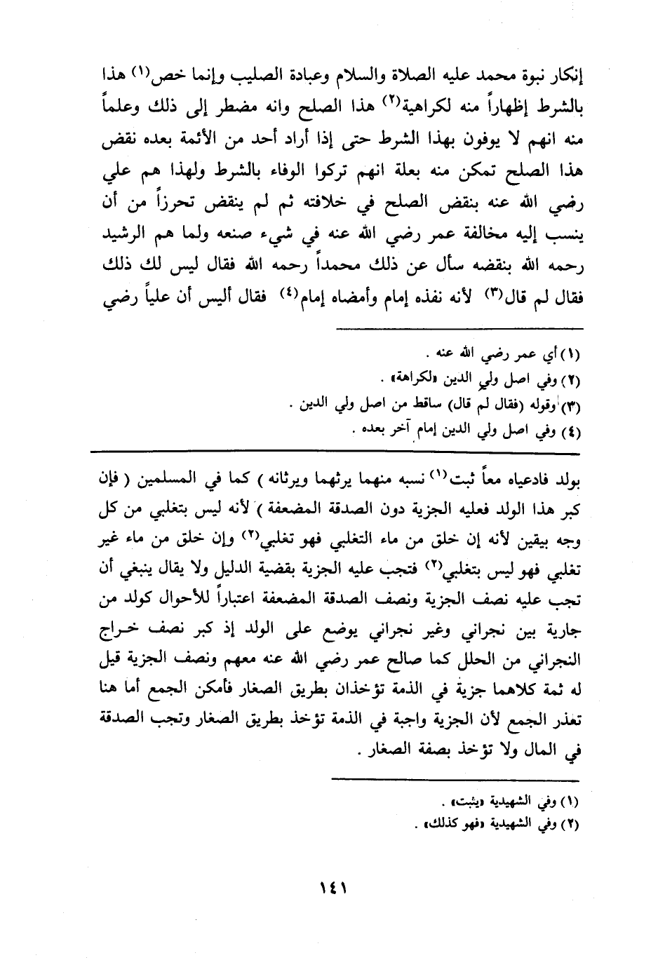 إِنْكَار نبوة مُحَمَّد عَلَيْهِ الصَّلَاة وَالسَّلَام وَعبادَة الصَّلِيب وَإِنَّمَا خص هَذَا بِالشّرطِ إِظْهَارًا مِنْهُ لكراهية هَذَا الصُّلْح وانه مُضْطَر إِلَى ذَلِك وعلما مِنْهُ انهم لايوفون بِهَذَا الشَّرْط حَتَّى إِذا أَرَادَ أحد من الْأَئِمَّة بعده نقض هَذَا الصُّلْح تمكن مِنْهُ بعلة انهم تركُوا الْوَفَاء بِالشّرطِ وَلِهَذَا هم عَليّ رَضِي الله عَنهُ بِنَقْض الصُّلْح فِي خِلَافَته ثمَّ لم ينْقض تَحَرُّزًا من أَن ينْسب إِلَيْهِ مُخَالفَة عمر رَضِي الله عَنهُ فِي شَيْء صنعه وَلما هم الرشيد رَحمَه الله بنقضه سَأَلَ عَن ذَلِك مُحَمَّدًا رَحمَه الله فَقَالَ لَيْسَ لَك ذَلِك فَقَالَ لم قَالَ لِأَنَّهُ نفذه إِمَام وأمضاه إِمَام فَقَالَ أَلَيْسَ أَن عليا رَضِي