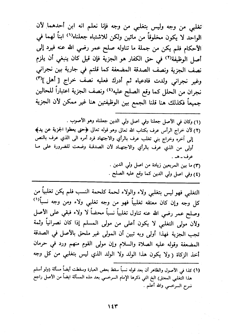 ـــــــــــــــــــــــــــــQالتغلبي فَهُوَ لَيْسَ بتغلبي وَلَاء وَالْوَلَاء لحْمَة كلحمة النّسَب فَلم يكن تغلبيا من كل وَجه وَإِن كَانَ مُعْتقه تغلبيا فَهُوَ من وَجه تغلبي وَلَاء وَمن وَجه نسبا وَصلح عمر رَضِي الله عَنهُ تنَاول تغلبيا نسبا مَحْضا لَا وَلَاء فَبَقيَ على الأَصْل وَلِأَن مولى التغلبي لَا يكون أَعلَى من مولى الْمُسلم إِذا كَانَ نَصْرَانِيّا وثمة تجب الْجِزْيَة فَهَذَا أولى وَبِه تبين أَن الْمولى غير مُلْحق بِالْأَصْلِ فِي الصَّدَقَة المضعفة وَقَوله عَلَيْهِ الصَّلَاة وَالسَّلَام وَإِن مولى الْقَوْم مِنْهُم ورد فِي حرمَان أَخذ الزَّكَاة وَلَا يكون هَذَا الْوَلَد وَلَا الْوَلَد الَّذِي لَيْسَ بتغلبي من كل وَجه