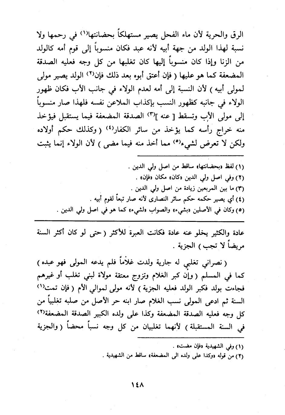 الرّقّ وَالْحريَّة لِأَن مَاء الْفَحْل يصير مُسْتَهْلكا بحضانتها فِي رَحمهَا وَلَا نِسْبَة لهَذَا الْوَلَد من جِهَة أَبِيه لِأَنَّهُ عبد فَكَانَ مَنْسُوبا إِلَى قوم أمه كَالْوَلَدِ من الزِّنَا وَإِذا كَانَ مَنْسُوبا إِلَيْهَا كَانَ تغلبها من كل وَجه فَعَلَيهِ الصَّدَقَة المضعفة كَمَا هُوَ عَلَيْهَا فَإِن أعتق أَبوهُ بعد ذَلِك فَإِن الْوَلَد يصير مولى لمولى أَبِيه لِأَن النِّسْبَة إِلَى أمه لعدم الْوَلَاء فِي جَانب الْأَب فَكَانَ ظُهُور الْوَلَاء فِي جَانِبه كظهور النّسَب بإكذاب الْملَاعن نَفسه فَلهَذَا صَار مَنْسُوبا إِلَى مولى الْأَب وَتسقط عَنهُ الصَّدَقَة المضعفة فِيمَا يسْتَقْبل فَيُؤْخَذ مِنْهُ خراج رَأسه كَمَا يُؤْخَذ من سَائِر الْكفَّار وَكَذَلِكَ حكم أَوْلَاده وَلَكِن لَا تعرض لشَيْء مِمَّا أَخذ مِنْهُ فِيمَا مضى لِأَن الْوَلَاء إِنَّمَا يثبت