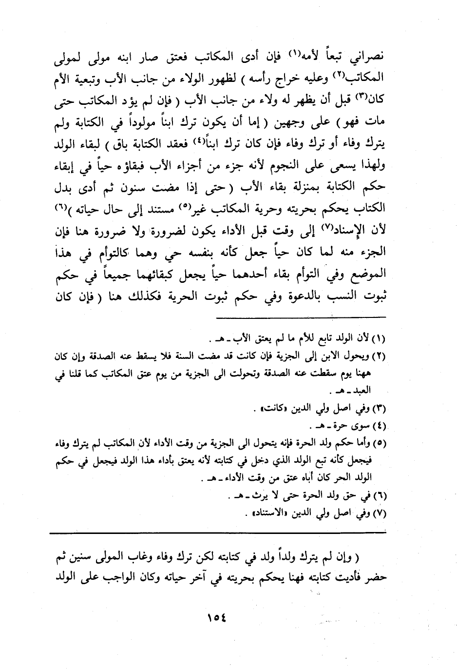 نَصْرَانِيّ تبعا لأمه فَإِن أدّى الْمكَاتب فَعتق صَار ابْنه مولى لمولى الْمكَاتب وَعَلِيهِ خراج رَأسه لظُهُور الْوَلَاء من جَانب الْأَب وتبعية الْأُم كَانَ قبل أَن يظْهر لَهُ وَلَاء من جَانب الْأَب فَإِن لم يؤد الْمكَاتب حَتَّى مَاتَ فَهُوَ على وَجْهَيْن إِمَّا أَن يكون ترك ابْنا مولودا فِي الْكِتَابَة وَلم يتْرك وَفَاء أَو ترك وَفَاء فَإِن كَانَ ترك ابْنا فعقد الْكِتَابَة بَاقٍ لبَقَاء الْوَلَد وَلِهَذَا يسْعَى على النُّجُوم لِأَنَّهُ جُزْء من أَجزَاء الْأَب فبقاؤه حَيا فِي إبْقَاء حكم الْكِتَابَة بِمَنْزِلَة بَقَاء الْأَب حَتَّى إِذا مَضَت سنُون ثمَّ أدّى بدل الْكتاب يحكم بحريَّته وحرية الْمكَاتب غير مُسْتَند إِلَى حَال حَيَاته لِأَن الْإِسْنَاد إِلَى وَقت قبل الْأَدَاء يكون لضَرُورَة وَلَا ضَرُورَة هُنَا فَإِن الْجُزْء مِنْهُ لما كَانَ حَيا جعل كَأَنَّهُ بِنَفسِهِ حَيّ وهما كالتوأم فِي هَذَا الْموضع وَفِي التوأم بَقَاء أَحدهمَا حَيا يَجْعَل كبقائهما جَمِيعًا فِي حكم ثُبُوت النّسَب بالدعوة وَفِي حكم ثُبُوت الْحُرِّيَّة فَكَذَلِك هُنَا فَإِن كَانَ
