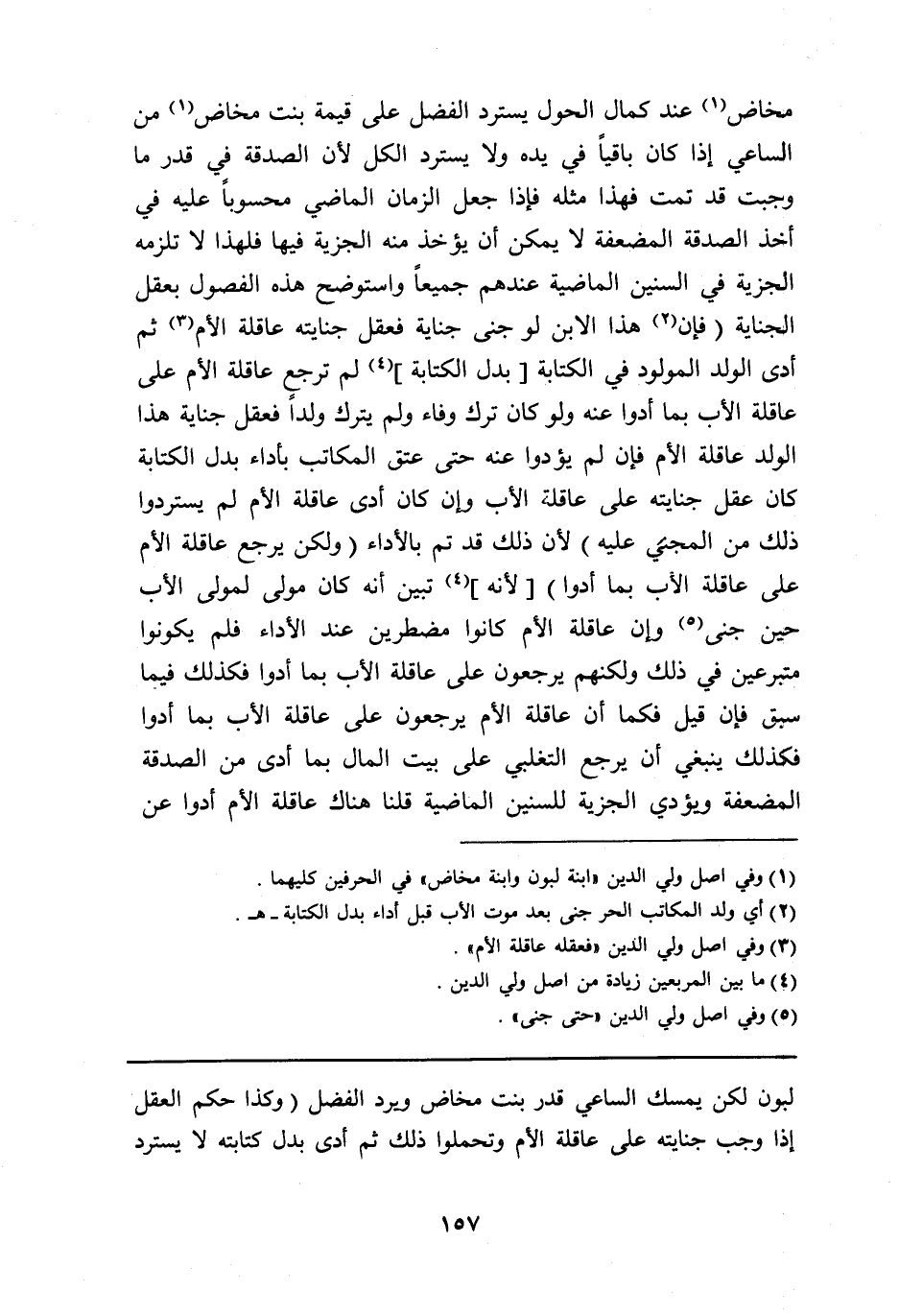 مَخَاض عِنْد كَمَال الْحول يسْتَردّ الْفضل على قيمَة بنت مَخَاض من السَّاعِي إِذا كَانَ بَاقِيا فِي يَده وَلَا يسْتَردّ الْكل لِأَن الصَّدَقَة فِي قدر مَا وَجَبت قد تمت فَهَذَا مثله فَإِذا جعل الزَّمَان الْمَاضِي محسوبا عَلَيْهِ فِي أَخذ الصَّدَقَة المضعفة لَا يُمكن أَن يُؤْخَذ مِنْهُ الْجِزْيَة فِيهَا فَلهَذَا لَا تلْزمهُ الْجِزْيَة فِي السنين الْمَاضِيَة عِنْدهم جَمِيعًا واستوضح هَذِه الْفُصُول بعقل الْجِنَايَة فَإِن هَذَا الابْن لَو جنى جِنَايَة فعقل جِنَايَته عَاقِلَة الْأُم ثمَّ أدّى الْوَلَد الْمَوْلُود فِي الْكِتَابَة بدل الْكِتَابَة لم ترجع عَاقِلَة الْأُم على عَاقِلَة الْأَب بِمَا أَدّوا عَنهُ وَلَو كَانَ ترك وَفَاء وَلم يتْرك ولدا فعقل جِنَايَة هَذَا الْوَلَد عَاقِلَة الْأُم فَإِن لم يؤدوا عَنهُ حَتَّى عتق الْمكَاتب بأَدَاء بدل الْكِتَابَة كَانَ عقل جِنَايَته على عَاقِلَة الْأَب وَإِن كَانَ أدّى عَاقِلَة الْأُم لم يستردوا ذَلِك من الْمَجْنِي عَلَيْهِ لِأَن ذَلِك قد تمّ بِالْأَدَاءِ وَلَكِن يرجع عَاقِلَة الْأُم على عَاقِلَة الْأَب بِمَا أَدّوا لِأَنَّهُ تبين أَنه كَانَ مولى لمولى الْأَب حِين جنى وَإِن عَاقِلَة الْأُم كَانُوا مضطرين عِنْد الْأَدَاء فَلم يَكُونُوا متبرعين فِي ذَلِك وَلَكنهُمْ يرجعُونَ على عَاقِلَة الْأَب بِمَا أَدّوا فَكَذَلِك فِيمَا سبق فَإِن قيل فَكَمَا أَن عَاقِلَة الْأُم يرجعُونَ على عَاقِلَة الْأَب بِمَا أَدّوا فَكَذَلِك يَنْبَغِي أَن يرجع التغلبي على بَيت المَال بِمَا أدّى من الصَّدَقَة المضعفة وَيُؤَدِّي الْجِزْيَة للسنين الْمَاضِيَة قُلْنَا هُنَاكَ عَاقِلَة الْأُم أَدّوا عَن