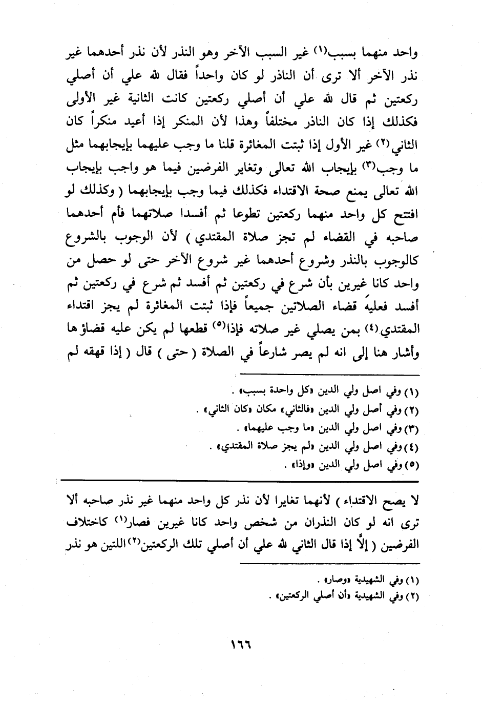 وَاحِد مِنْهُمَا بِسَبَب غير السَّبَب الآخر وَهُوَ النّذر لِأَن نذر أَحدهمَا غير نذر الآخر أَلا ترى أَن النَّاذِر لَو كَانَ وَاحِدًا فَقَالَ لله عَليّ أَن أُصَلِّي رَكْعَتَيْنِ ثمَّ قَالَ لله عَليّ أَن أُصَلِّي رَكْعَتَيْنِ كَانَت الثَّانِيَة غير الأولى فَكَذَلِك إِذا كَانَ النَّاذِر مُخْتَلفا وَهَذَا لِأَن الْمُنكر إِذا أُعِيد مُنْكرا كَانَ الثَّانِي غير الأول إِذا ثبتَتْ المغائرة قُلْنَا مَا وَجب عَلَيْهِمَا بإيجابهما مثل مَا وَجب بِإِيجَاب الله تَعَالَى وتغاير الفرضين فِيمَا هُوَ وَاجِب بِإِيجَاب الله تَعَالَى يمْنَع صِحَة الِاقْتِدَاء فَكَذَلِك فِيمَا وَجب بإيجابهما وَكَذَلِكَ لَو افْتتح كل وَاحِد مِنْهُمَا رَكْعَتَيْنِ تَطَوّعا ثمَّ أفسدا صلاتهما فَأم أَحدهمَا صَاحبه فِي الْقَضَاء لم تجز صَلَاة الْمُقْتَدِي لِأَن الْوُجُوب بِالشُّرُوعِ كالوجوب بِالنذرِ وشروع أَحدهمَا غير شُرُوع الآخر حَتَّى لَو حصل من وَاحِد كَانَا غيرين بِأَن شرع فِي رَكْعَتَيْنِ ثمَّ أفسد ثمَّ شرع فِي رَكْعَتَيْنِ ثمَّ أفسد فَعَلَيهِ قَضَاء الصَّلَاتَيْنِ جَمِيعًا فَإِذا ثبتَتْ المغائرة لم يجز اقْتِدَاء الْمُقْتَدِي بِمن يُصَلِّي غير صلَاته فَإِذا قطعهَا لم يكن عَلَيْهِ قَضَاؤُهَا وَأَشَارَ هُنَا إِلَى انه لم يصر شَارِعا فِي الصَّلَاة حَتَّى قَالَ إِذا قهقه لم