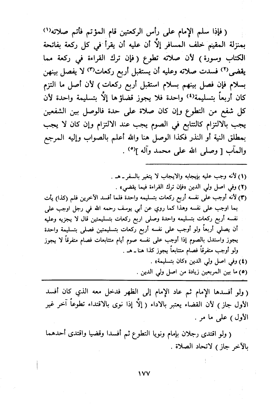 فَإِذا سلم الإِمَام على رَأس الرَّكْعَتَيْنِ قَامَ الْمُؤْتَم فَأَتمَّ صلَاته بِمَنْزِلَة الْمُقِيم خلف الْمُسَافِر إِلَّا أَن عَلَيْهِ أَن يقْرَأ فِي كل رَكْعَة بِفَاتِحَة الْكتاب وَسورَة لِأَن صلَاته تطوع فَإِن ترك الْقِرَاءَة فِي رَكْعَة مِمَّا يقْضى فَسدتْ صلَاته وَعَلِيهِ أَن يسْتَقْبل أَربع رَكْعَات لَا يفصل بَينهُنَّ بِسَلام فَإِن فصل بَينهم بِسَلام اسْتقْبل أَربع رَكْعَات لِأَن أصل مَا الْتزم كَانَ أَرْبعا بِتَسْلِيمَة وَاحِدَة فَلَا يجوز قَضَاؤُهَا إِلَّا بِتَسْلِيمَة وَاحِدَة لِأَن كل شفع من التَّطَوُّع وَإِن كَانَ صَلَاة على حِدة فالوصل بَين الشفعين يجب بالالتزام كالتتابع فِي الصَّوْم يجب عِنْد الِالْتِزَام وَإِن كَانَ لَا يجب بِمُطلق النِّيَّة أَو النّذر فَكَذَا الْوَصْل هُنَا وَالله أعلم بِالصَّوَابِ وَإِلَيْهِ الْمرجع والمآب وَصلى الله على مُحَمَّد وَآله