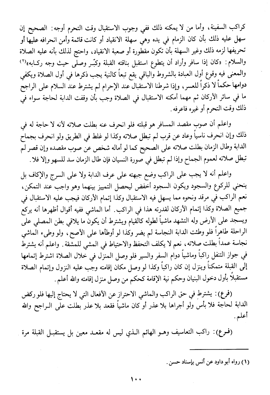 (كَانَ إِذا سَافر وَأَرَادَ أَن يتَطَوَّع اسْتقْبل بناقته الْقبْلَة وَكبر وَصلى حَيْثُ وَجه ركابه) وَالْمعْنَى فِيهِ وُقُوع أول الْعِبَادَة بِالشُّرُوطِ وَالْبَاقِي يَقع تبعا كالنية يجب ذكرهَا فِي أول الصَّلَاة وَيَكْفِي دوامها حكما لَا ذكرا للعسر وَإِذا شرطنا الِاسْتِقْبَال عِنْد الاحرام لم يشْتَرط عِنْد السَّلَام على الرَّاجِح مَا فِي سَائِر الْأَركان ثمَّ مهما أمكنه الِاسْتِقْبَال فِي الصَّلَاة وَجب بِأَن وقفت الدَّابَّة لحَاجَة سَوَاء فِي ذَلِك وَقت التَّحَرُّم أَو غَيره فاعرفه