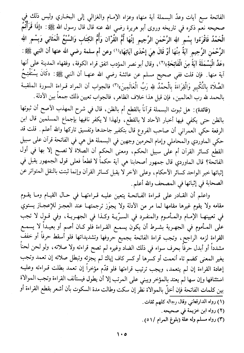 وَاعْلَم أَن الْقَادِر على قِرَاءَة الْفَاتِحَة يتَعَيَّن عَلَيْهِ قرَاءَتهَا فِي حَال الْقيام وَمَا يقوم مقَامه وَلَا يقوم غَيرهَا مقَامهَا لما مر من الْأَدِلَّة وَلَا يجوز ترجمتها عِنْد الْعَجز للإعجاز يَسْتَوِي فِي تَعْيِينهَا الامام وَالْمَأْمُوم وَالْمُنْفَرد فِي السّريَّة وَكَذَا فِي الجهرية وَفِي قَول لَا تجب على الْمَأْمُوم فِي الجهرية بِشَرْط أَن يكون يسمع الْقِرَاءَة فَلَو كَانَ أَصمّ أَو بَعيدا لَا يسمع الْقِرَاءَة لزمَه الرَّاجِح وَتجب قِرَاءَة الْفَاتِحَة بِجَمِيعِ حروفها وتشديداتها فَلَو أسقط حرفا أَو خفف مشدداً أَو بدل حرفا بِحرف سَوَاء فِي ذَلِك الضَّاد وَغَيره لم تصح قِرَاءَته وَلَا صلَاته وَلَو لحن لحنا بِغَيْر الْمَعْنى كضم تَاء أَنْعَمت أَو كسرهَا أَو كسر كَاف إياك لم يُجزئهُ وَتبطل صلَاته إِن تعمد وَتجب اعادة الْقِرَاءَة إِن لم يتَعَمَّد وَيجب تَرْتِيب قرَاءَتهَا فَلَو قدم مُؤَخرا إِن تعمد بطلت قِرَاءَته وَعَلِيهِ استئنافها وَإِن سَهَا لم يعْتد بالمؤخر وَيَبْنِي على الْمُرَتّب إِلَّا أَن يطول فيستأنف الْقِرَاءَة وَتجب الْمُوَالَاة بَين كَلِمَات الْفَاتِحَة فَإِن أخل بالموالاة نظر إِن سكت وطالت مُدَّة السُّكُوت بِأَن أشعر بِقطع الْقِرَاءَة أَو