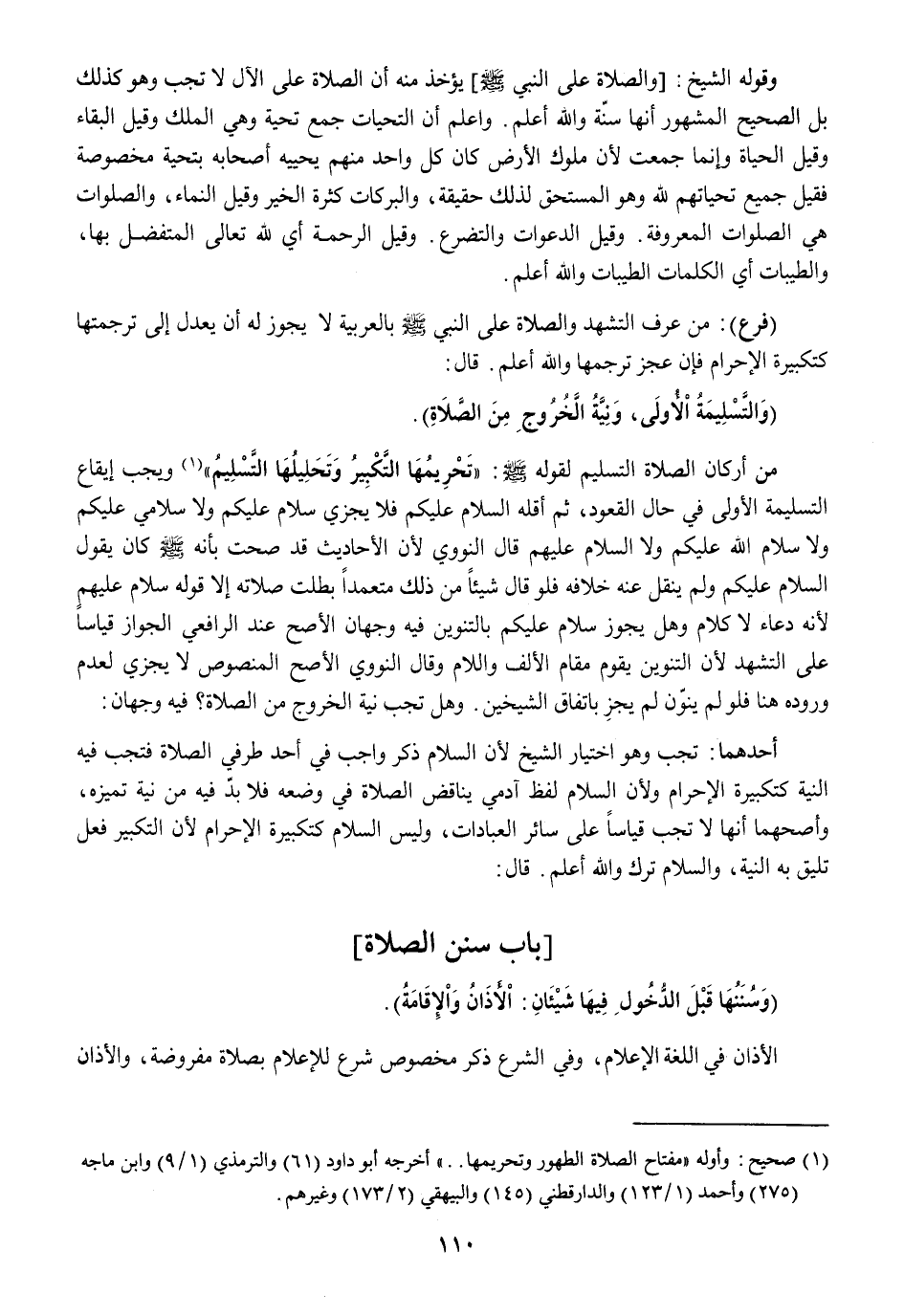 وَقَول السيخ وَالصَّلَاة على النَّبِي صلى الله عَلَيْهِ وَسلم يُؤْخَذ مِنْهُ أَن الصَّلَاة على الْآل لَا تجب وَهُوَ كَذَلِك بل الصَّحِيح الْمَشْهُور أَنَّهَا سنة وَالله أعلم وَاعْلَم أَن التَّحِيَّات جمع تَحِيَّة وَهِي الْملك وَقيل الْبَقَاء وَقيل الْحَيَاة وَإِنَّمَا جمعت لِأَن مُلُوك الأَرْض كَانَ كل وَاحِد مِنْهُم يحييه أَصْحَابه بِتَحِيَّة مَخْصُوصَة فَقيل جَمِيع تحياتهم لله وَهُوَ الْمُسْتَحق لذَلِك حَقِيقَة والبركات كَثْرَة الْخَيْر وَقيل النَّمَاء والصلوات هِيَ الصَّلَوَات الْمَعْرُوفَة وَقيل الدَّعْوَات والتضرع وَقيل الرَّحْمَة أَي لله تَعَالَى المتفضل بهَا والطيبات أَي الْكَلِمَات الطَّيِّبَات وَالله أعلم
